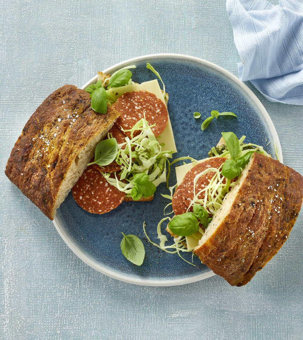 Fuldkornswrap med hamburgerryg, kalkunbacon og spinat