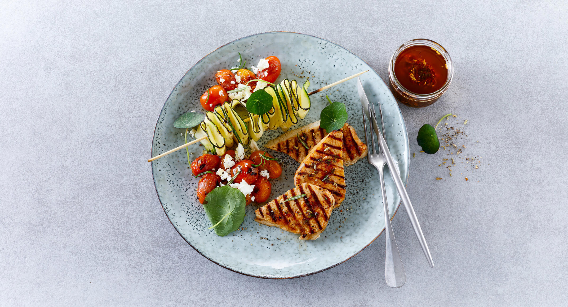 Grillspyd med Frankfurterpølse, bøf og chimichurri marinade