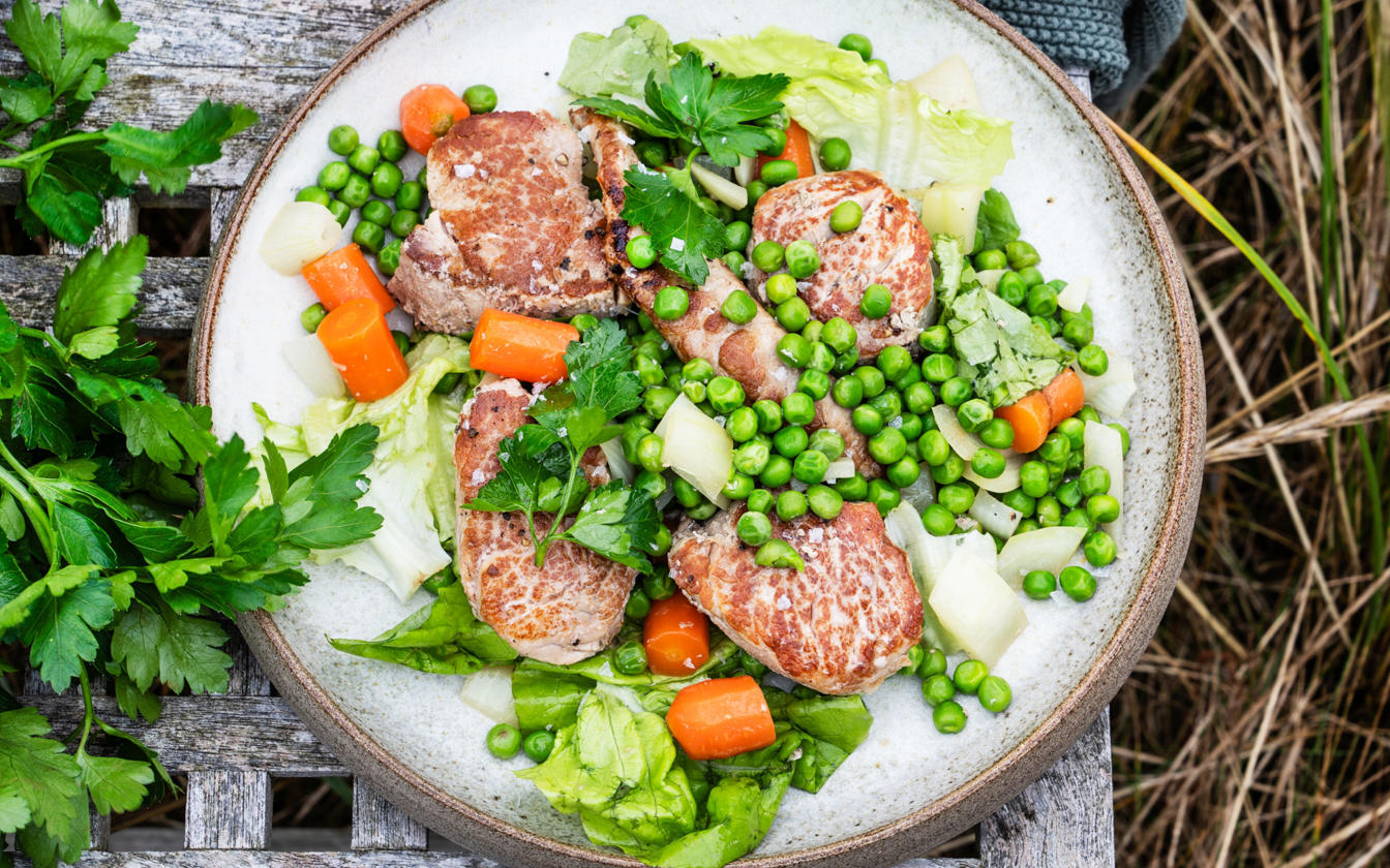 Her er en velsmagende og grøn fortolkning af den klassiske ret "ærter à la francaise" – denne gang med saftige bøffer skåret af mørbrad af gris. Den milde grisekød får selskab af sprødstegt bacon, søde ærter, gulerødder og hjertesalat i en let bouillon, der samler det hele i en smuk og rustik grydeanretning. Perfekt som hverdagsret eller til gæster – særligt med et godt surdejsbrød til at suge den smagfulde sauce op.