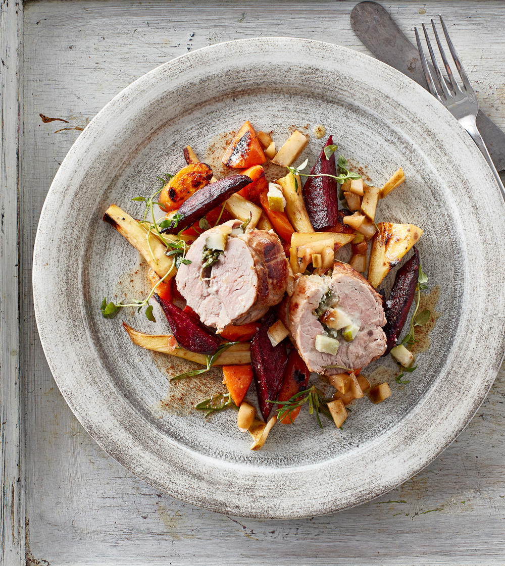Mørbrad fyldt med skalotteløg, pærer, rosmarin og ost