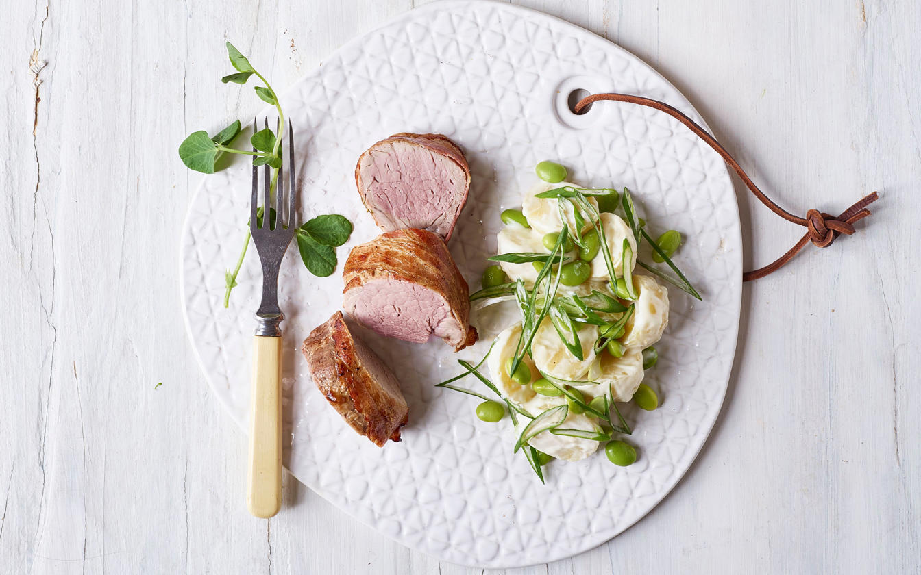 Mørbrad i baconsvøb & kartoffel-bønnesalat