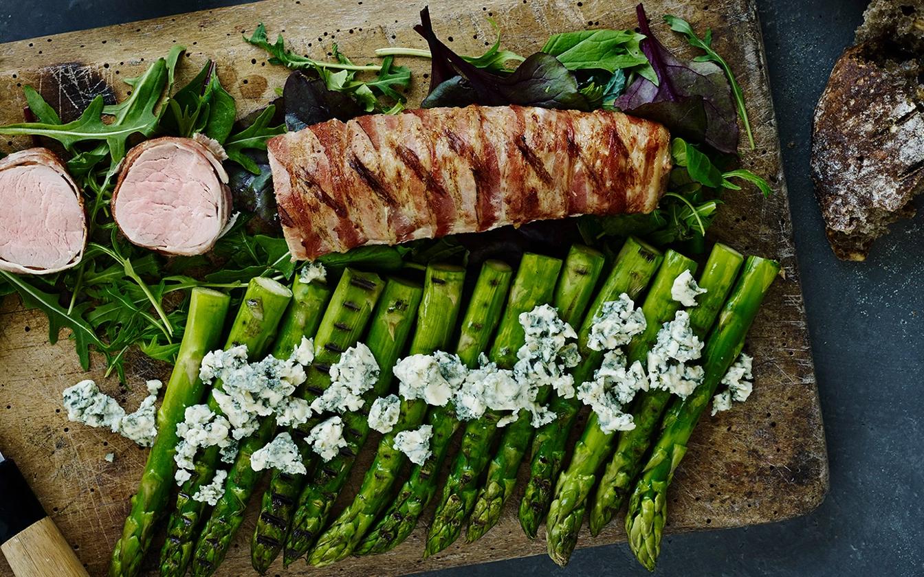 - Rå, grønne asparges kan pakkes ind i baconskiver, og grilles til baconen er sprød. Kan bruges som appetizer eller forret. Se vores opskrift på baconsvøbte asparges her.