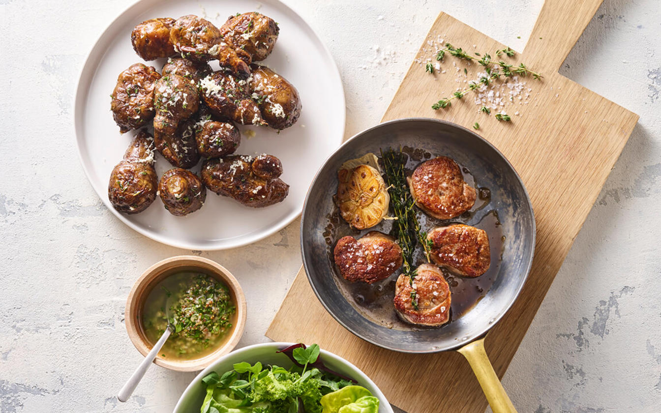 Mørbradbøffer med bagte jordskokker og efterårssalat i vinaigrette