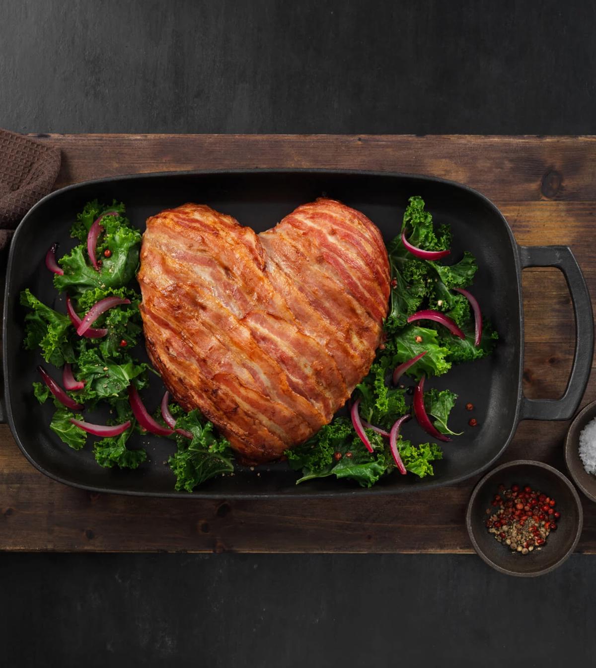 Det er vigtigt, når du lægger baconskiverne på den formede fars, at du får baconskiverne skubbet godt ind under bunden. På den måde bevares saften i kødet, når baconen trækker sig sammen, under stegningen i ovnen.