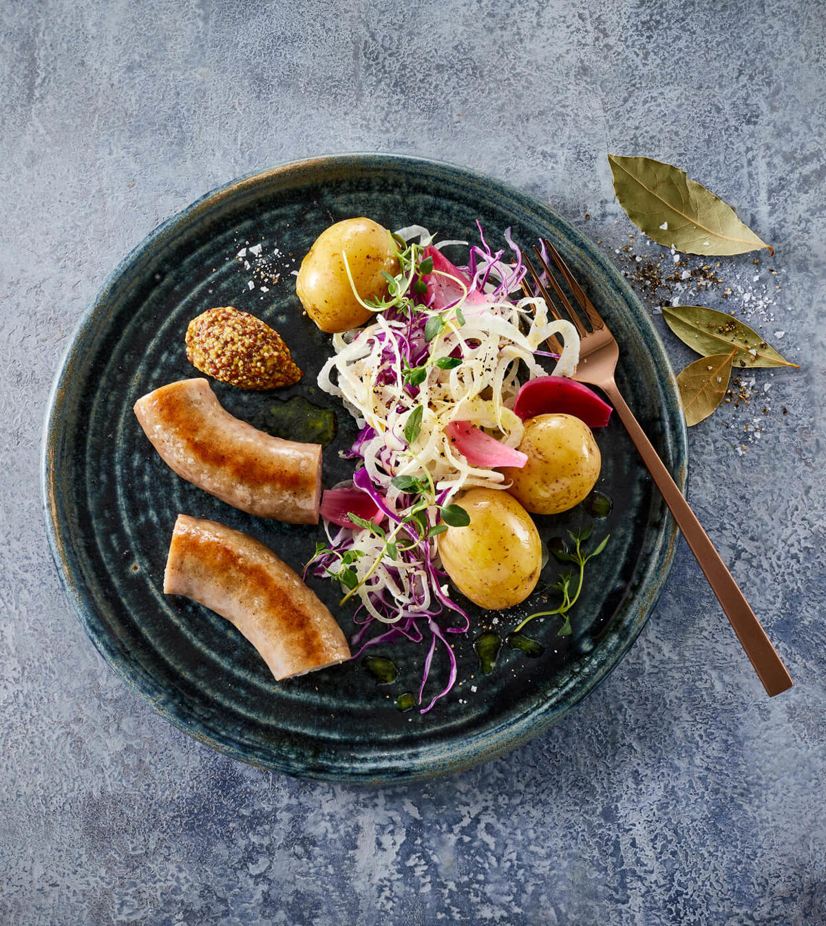 Oksegrydesteg med syltede svampe og salat på vinterkål