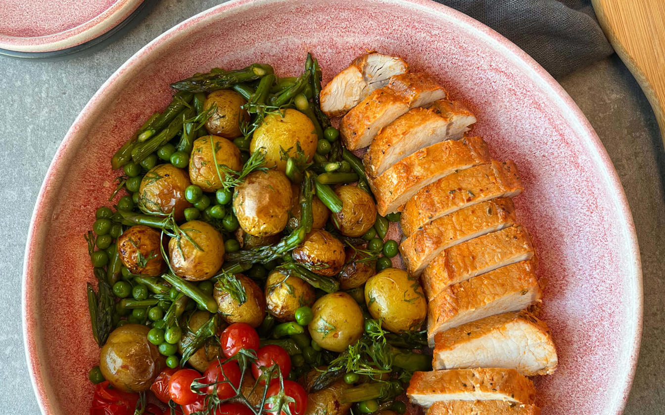 En let "one pan" opskrift, hvilket betyder, at alle ingredienserne tilberedes i samme ildfaste fad i ovnen. Først bliver kamfileten og kartofler stegt i ovnen, de sidste 10 minutter kartoflerne skal have i ovnen bliver sammen med asparges og tomater - nemt. Velbekomme!