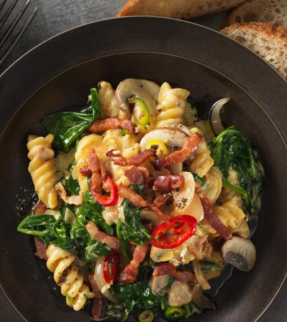 Denne nemme og cremede one pot pasta samler det hele i én gryde – og det smager fantastisk! Med hakket grisekød, sprød bacon og masser af grøntsager får du en fyldig ret, der varmer. Pikantost og mozzarella gør saucen lækkert cremet med en mild, krydret smag, som hele familien vil elske. Og det bedste? Alt tilberedes i én gryde, så du sparer både tid og opvask. Perfekt til travle hverdage eller når du bare vil have noget lækkert uden alt bøvlet.