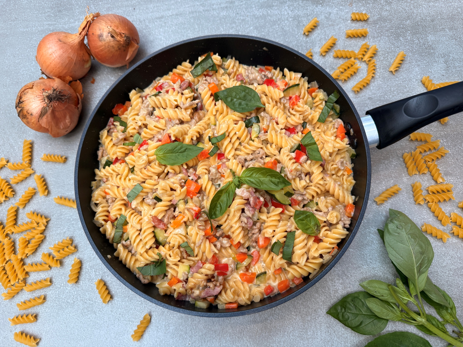 Denne nemme og cremede one pot pasta samler det hele i én gryde – og det smager fantastisk! Med hakket grisekød, sprød bacon og masser af grøntsager får du en fyldig ret, der varmer. Pikantost og mozzarella gør saucen lækkert cremet med en mild, krydret smag, som hele familien vil elske. Og det bedste? Alt tilberedes i én gryde, så du sparer både tid og opvask. Perfekt til travle hverdage eller når du bare vil have noget lækkert uden alt bøvlet.