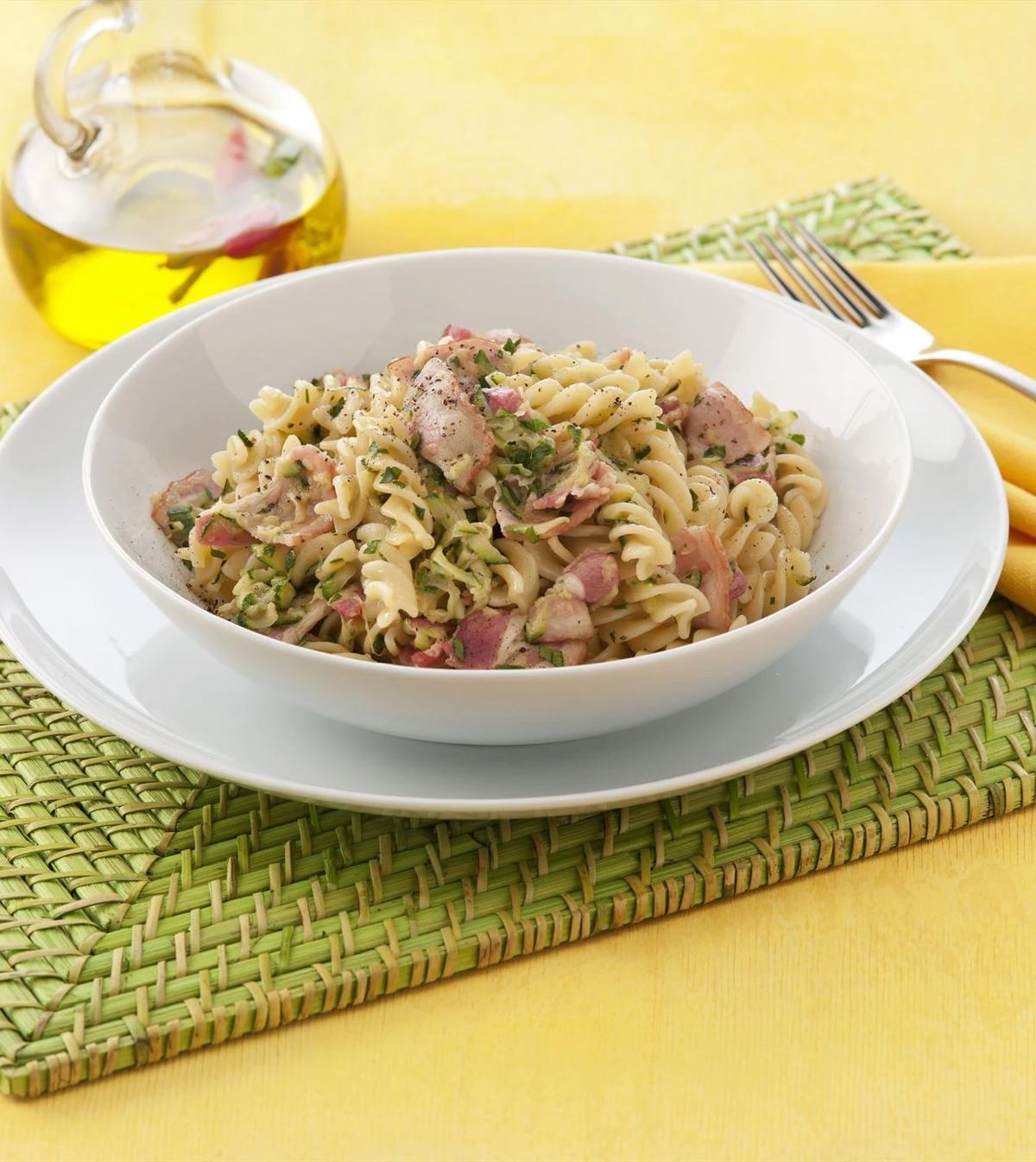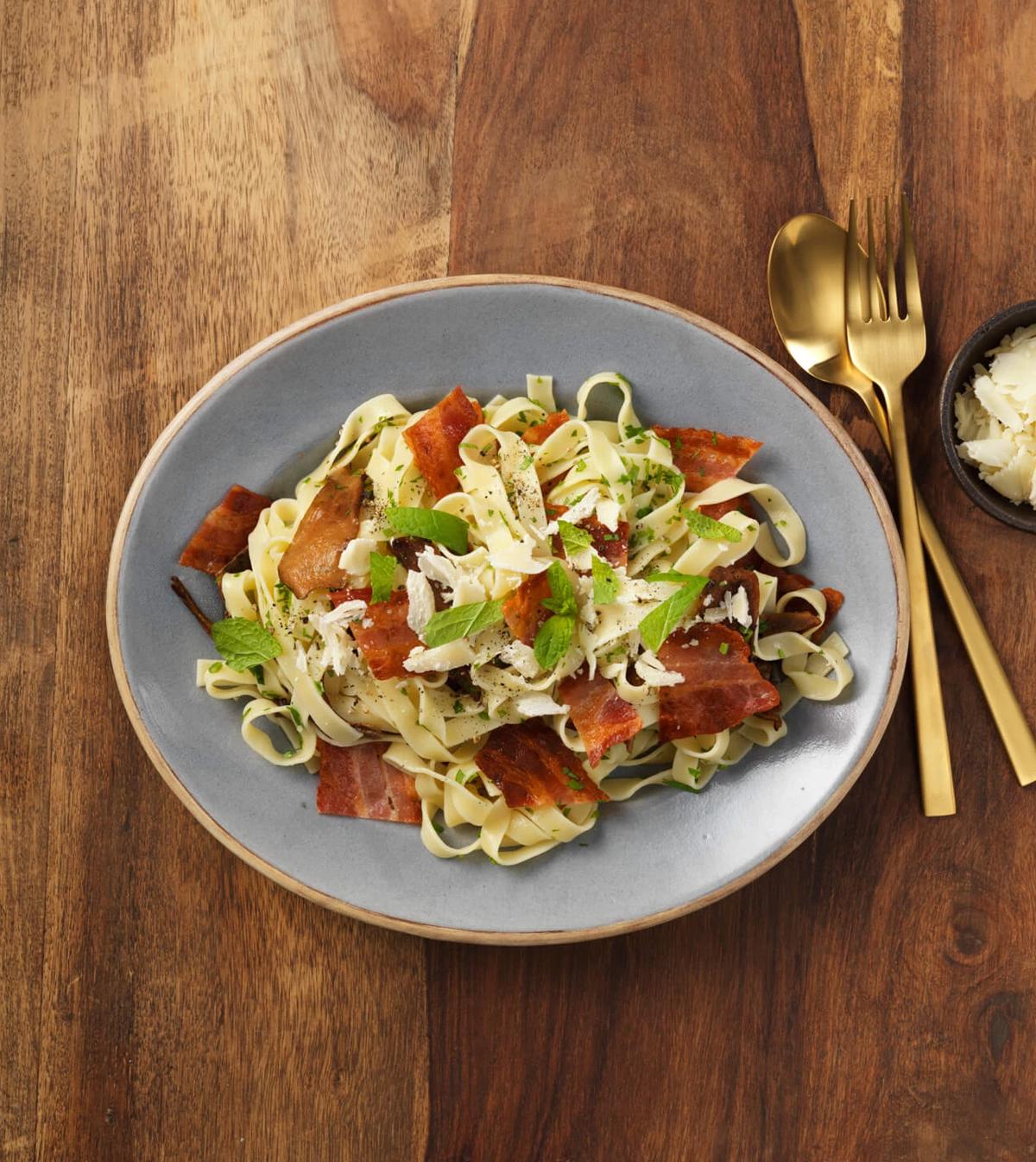 Svampe i form af champignoner er en smagsgivende og sublim råvare sammen med bacon og pasta. Kombinationen med tomater, hvidløg, oliven og parmesanost giver mange smagsindtryk og smelter sammen til en helhed. Retten kan varieres med mere eller mindre af de valgte råvarer, og man kan skabe sin egen favoritkombination.
