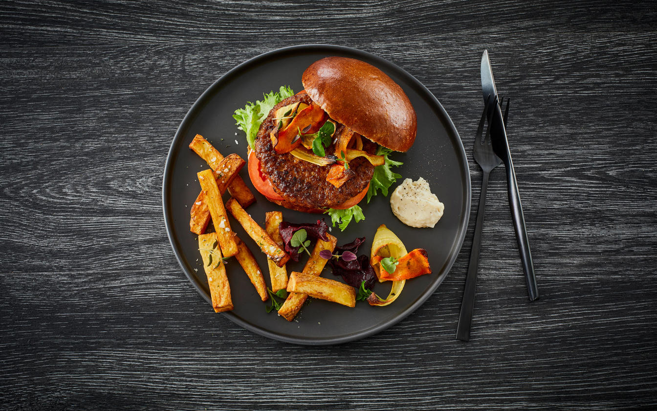 Her finder du opskriften på en Pork burger med briochebrød, salat, rødløg, bøftomat og spirer. Denne anrettes med urtefritter og parmesandip. Velbekomme.