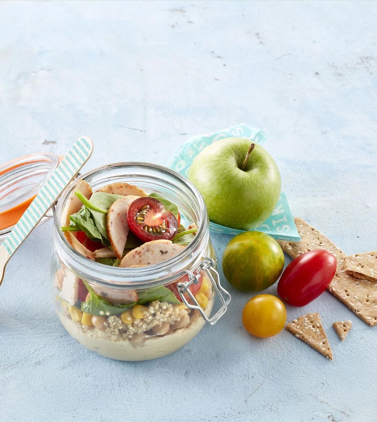 Denne proteinrige kikærtesalat med kylling og hummus er en nem og lækker løsning til frokost og madpakken. De sprøde bagte kikærter, frisk spidskål, cremet hummus, edamamebønner, smuldret feta og saftige cherrytomater skaber en skøn smagskombination. Prøv opskriften nu!