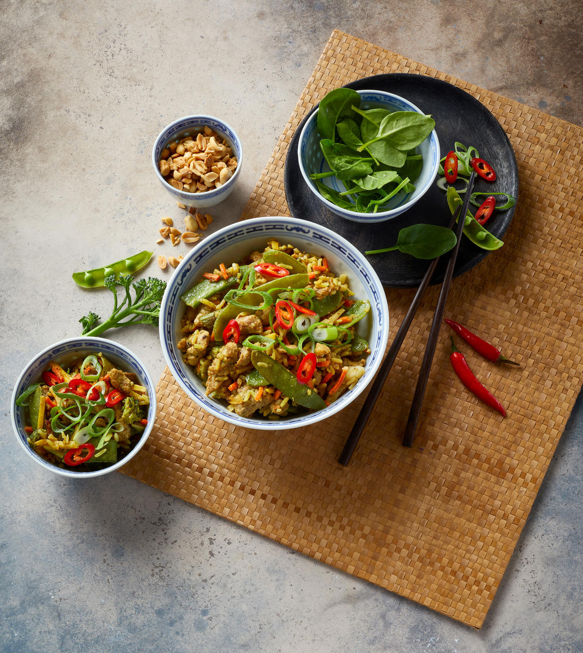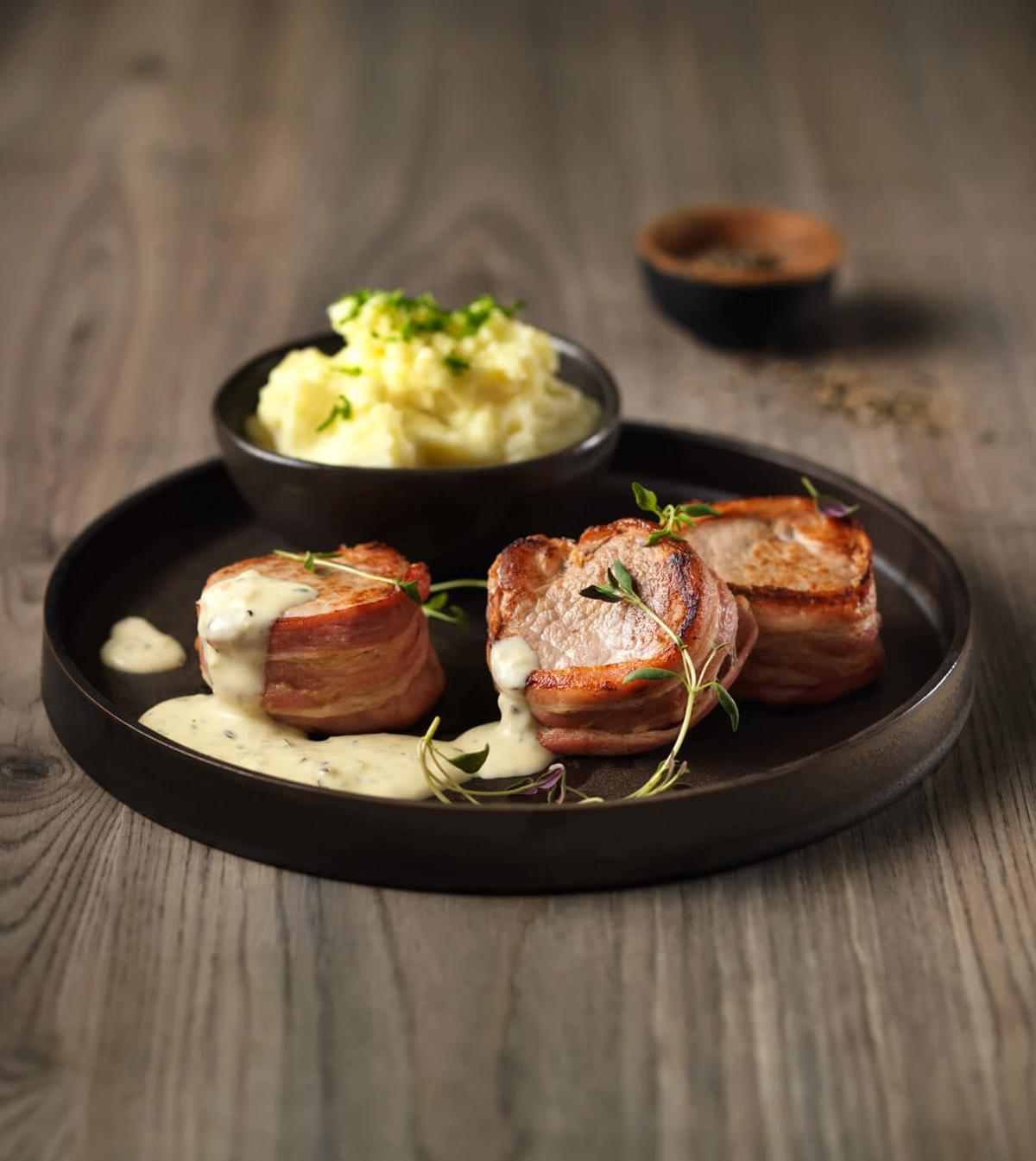 - Koteletter uden fedtkant (minutkoteletter) skæres af filet. Så hvis du ikke kan finde filet, kan du sagtens bruge koteletter i stedet. Skær dem i strimler og mariner (du kan nøjes med halvdelen af marinaden her). Steg på en pande ved høj varme, når bouillonen står og varmer. De skal have 1 minut på hver side.