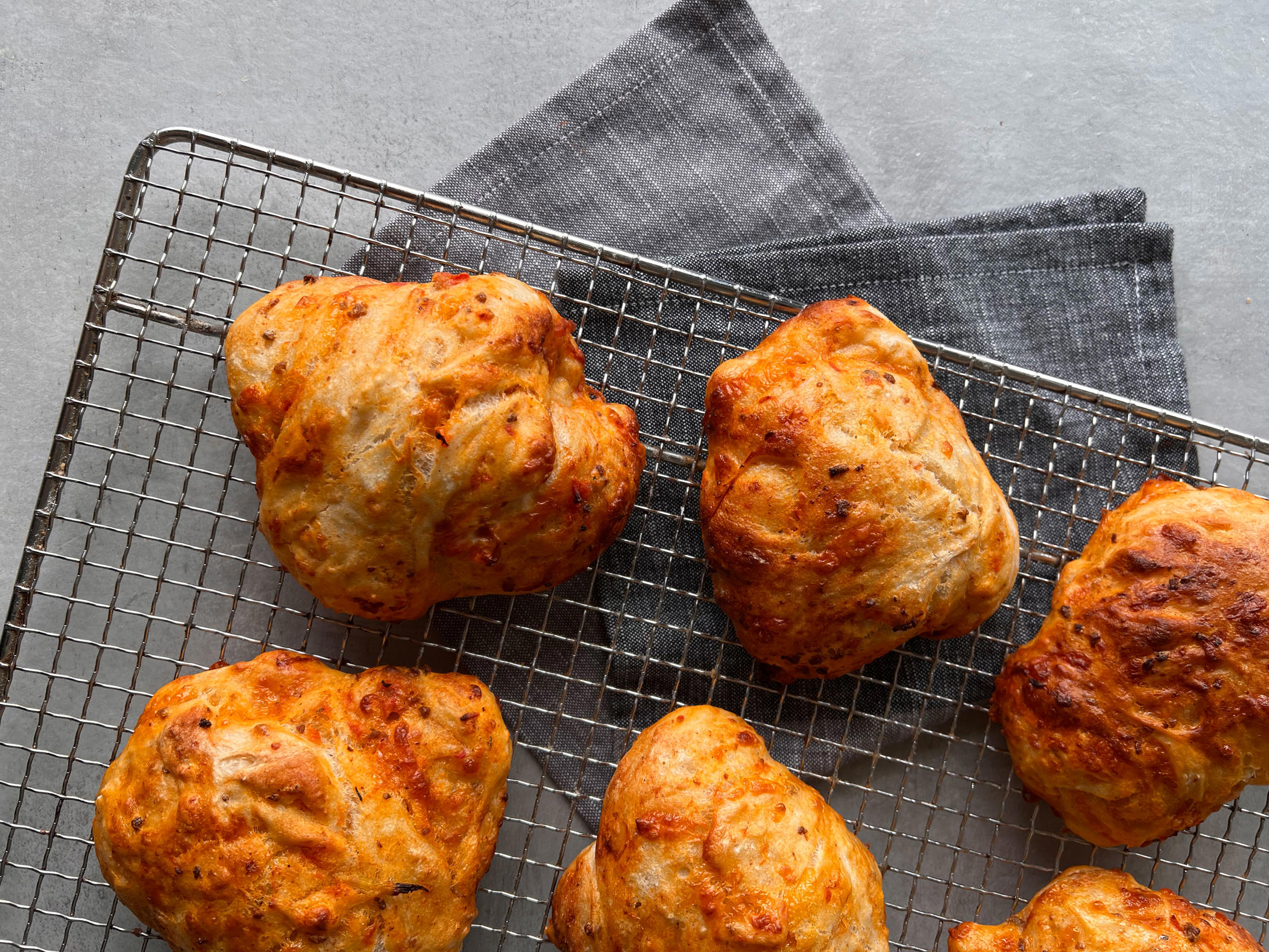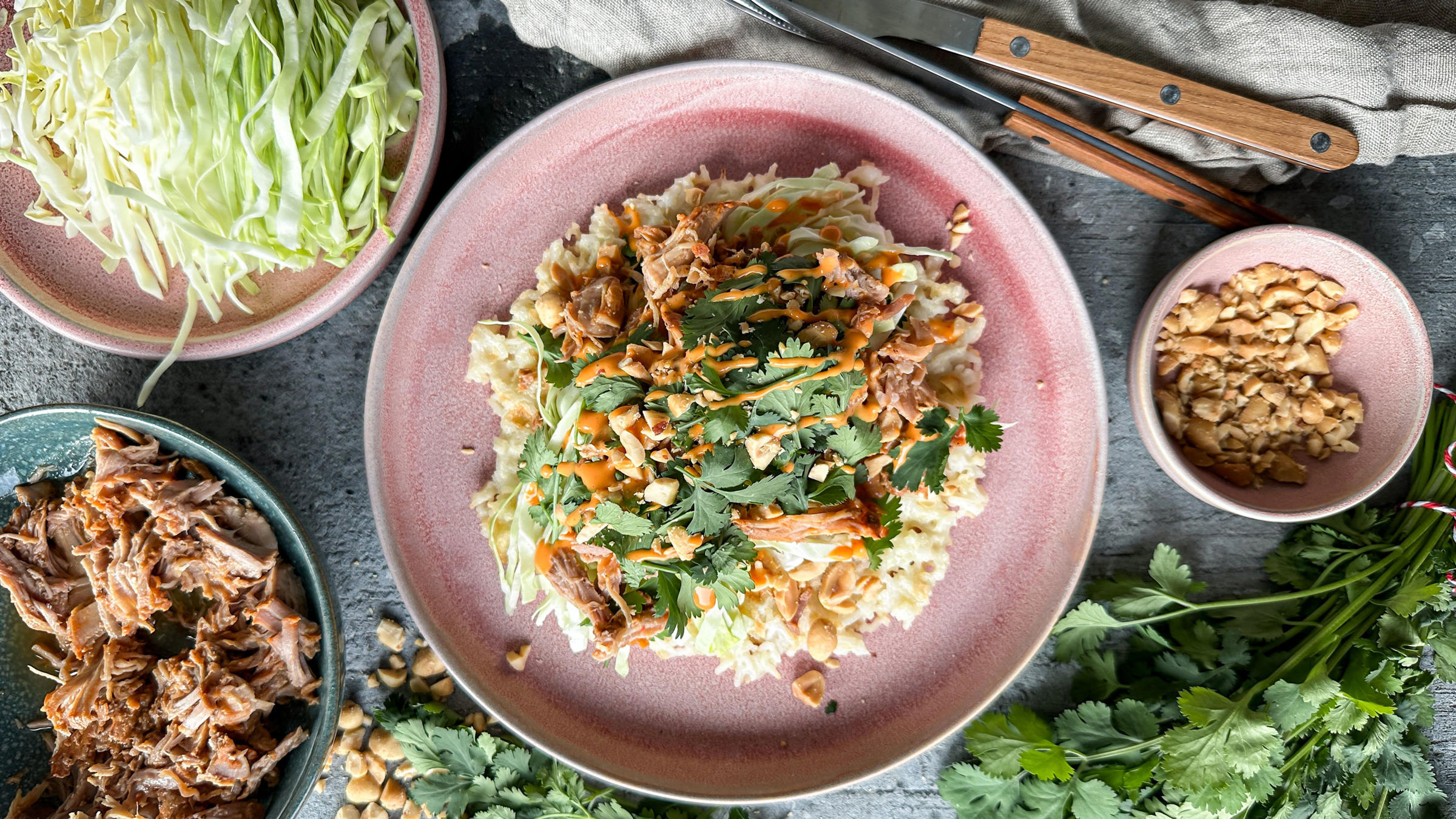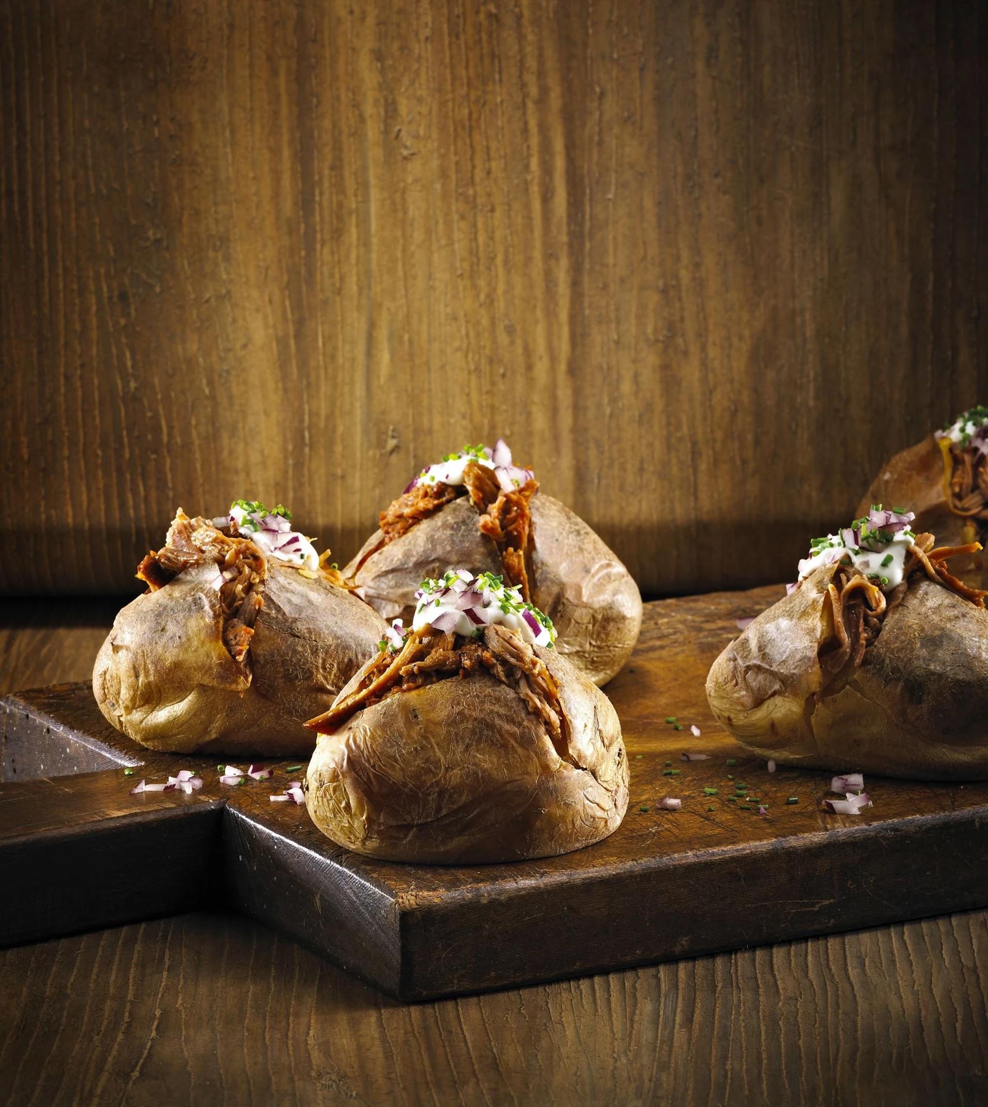 Bagekartofler med Pulled Pork, cremefraiche og rødløg