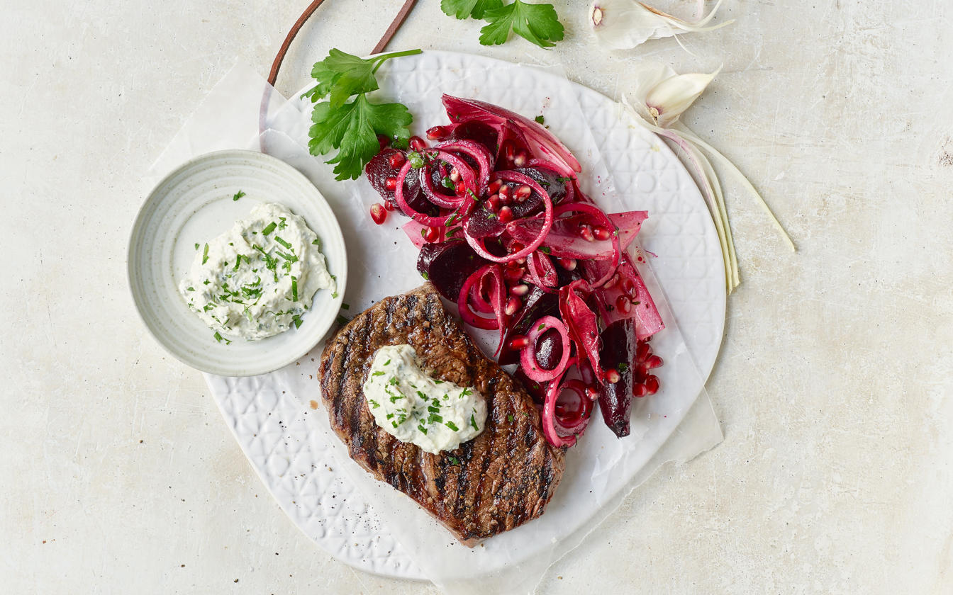 Ribeye med hvidløgssmør og bagt rødbedesalat