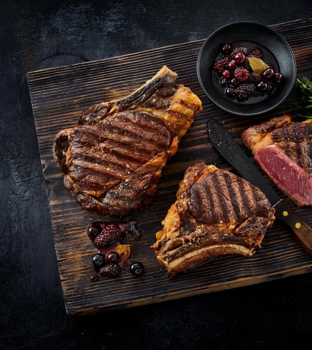 - Ribeye steaks er i det her tilfælde større og højere og skæres ud ved servering og kan deles mellem gæsterne. Her griller vi steaks ved høj direkte varme først indtil kødet får flotte grillstriber og en lækkert karamelliseret skorpe. Herefter flyttes steaks til indirekte varme indtil de rammer den ønskede kernetemperatur.