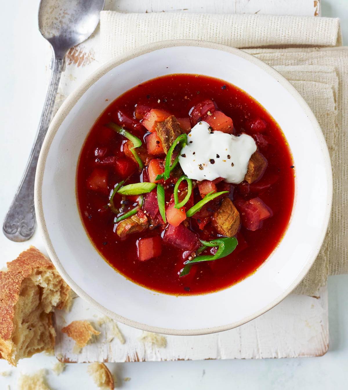 Denne rødbedesuppe er let og lækker og ser fantastisk ud med sin stærke røde farve. Rødbedesuppen er kogt på base af vores Mou Hønsekødssuppe, som er en skøn, smagfuld suppe, kogt på hele høns, oksekraftben og urter i otte timer.