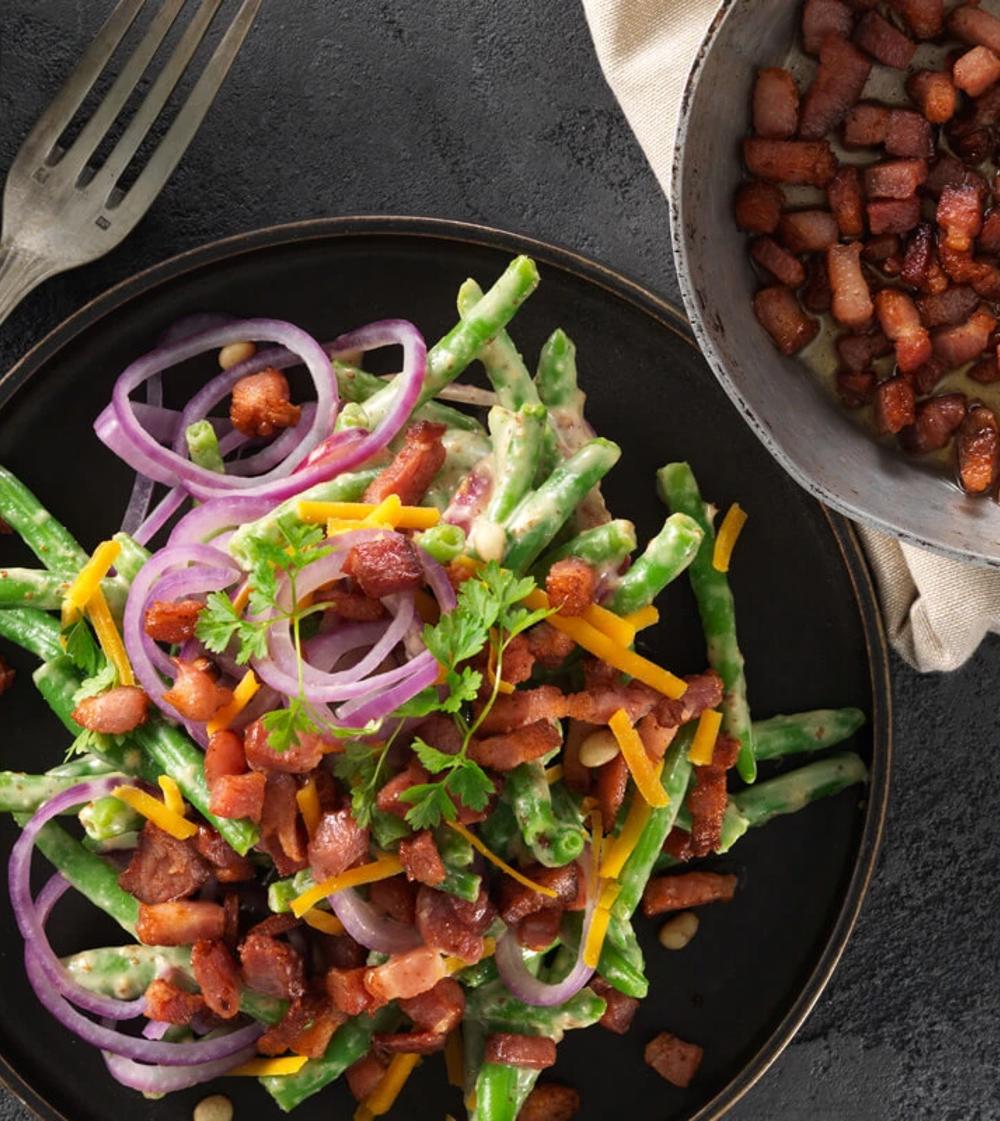 Marinerede bønner kan altså et eller andet. Hvad enten bønnerne kommer fra frost, eller om du er heldig at få fingre i en god portion friske bønner, så er bønnerne en gevinst for de fleste måltider efter en kort kogetid, fordi de både er rige på den karakteristiske ’grønne’ smag, men også giver masser af fylde til måltidet. Bønner har en dejlig mild smag, som kan understreges af en lækker dressing, for eksempel som her, hvor vi bruger olivenolie og citron – men en lille teskefuld stærk sennep skader absolut heller ikke.