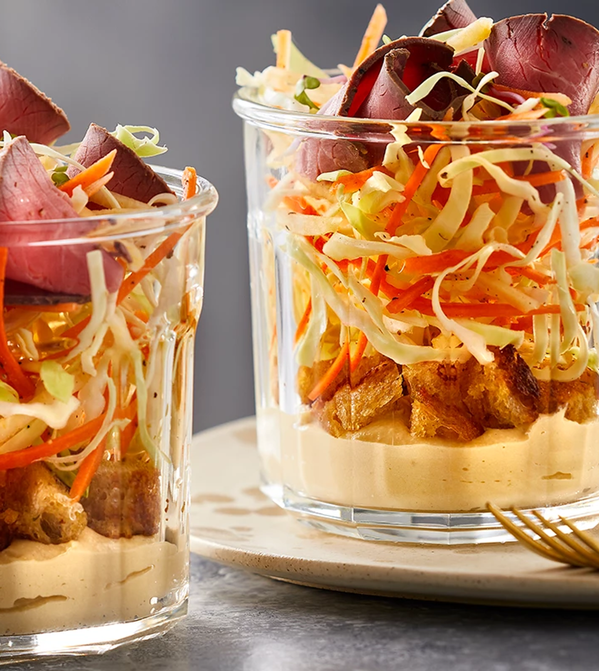 Anret til aftensmad i et stort fad eller i to ”to go” bowls. Fold skiver af roastbeef, og læg dem på salaten. Top med finthakket chili, granatæblekerner og pynt med frisk mynte. Du kan bruge alle rodfrugter og kartofler til salaten.