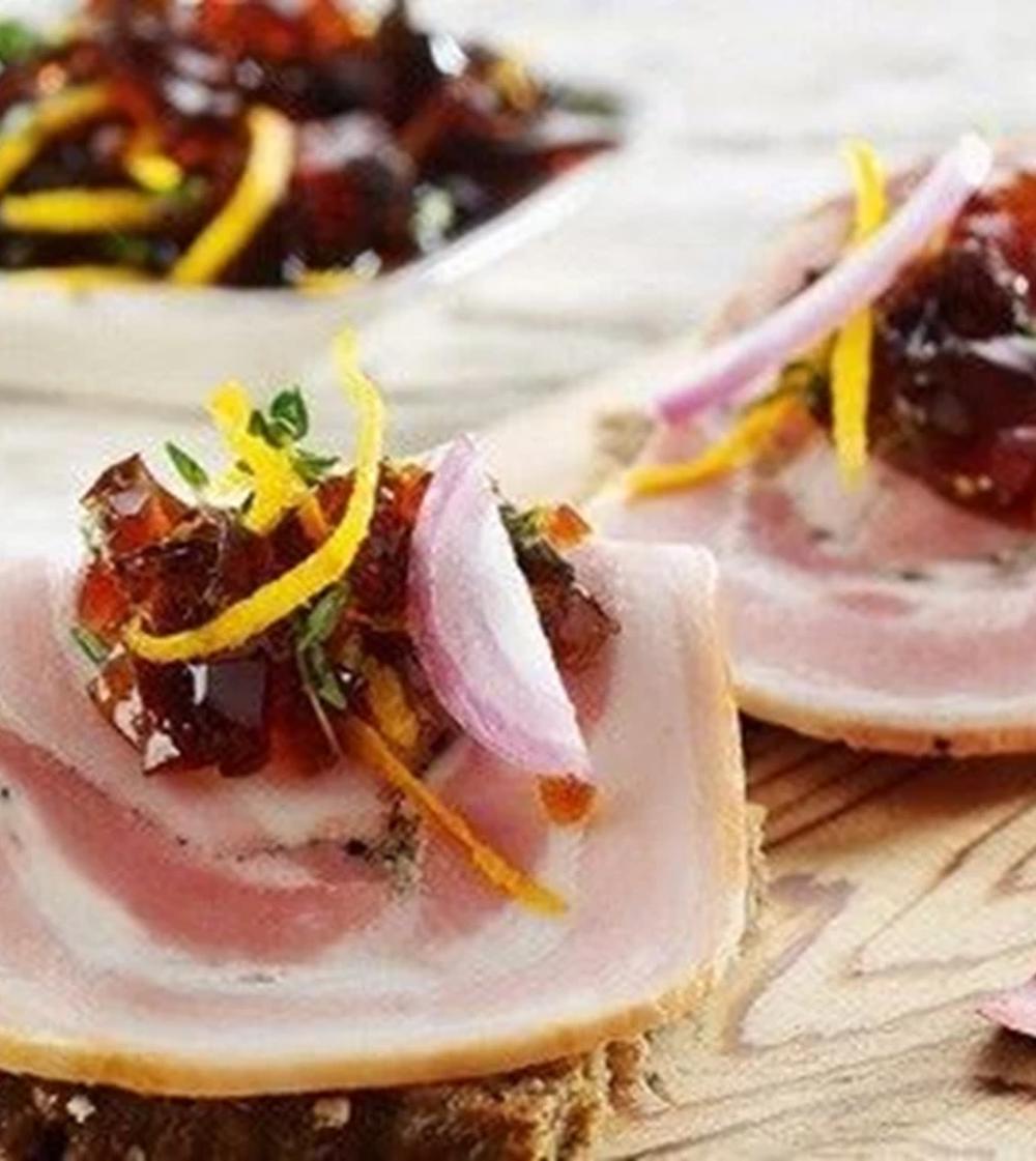 Sæt tænderne i et farverigt smørrebrød med masser af smag. De sprødristede rugbrødsskiver og den møre ålerøgede skinke er rettens fundament, som bliver fuldendt med kartoffelskiver, revet peberrod og rød spidskål. Purløg giver retten den sidste finish.