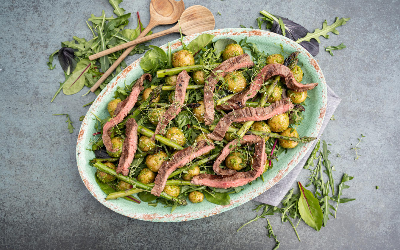 Salaten kan serveres med både kolde og lune kartofler. Brug den rest grillet kød du har – erstat evt. grillet flanksteak med koteletter, svinemørbrad eller andre rester af grillet kød.