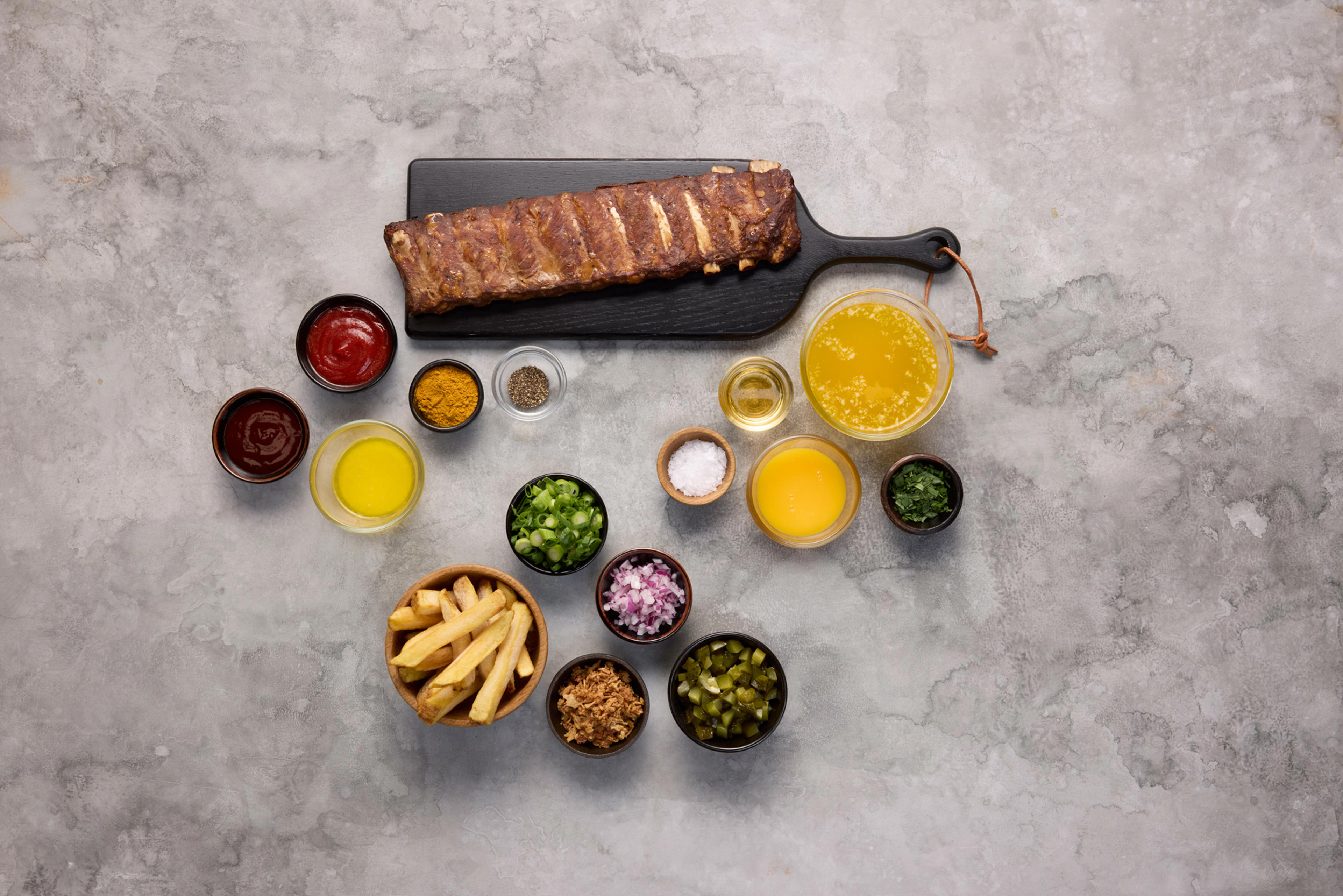 Spareribs mix er inspireret af en traditionel pølsemix, og forener Tulips saftige og møre spareribs krydret med karry/BBQ-sauce med sprøde pommes frites. Retten er ligeledes toppet med en cremet bearnaisesauce og knasende rå og ristede løg. I denne opskrift har vi lavet en marinade fra bunden, men du kan også sagtens bruge den marinade, der er vedlagt i emballagen. Vi har i opskriften tilberedt spareribsene i airfryeren, men du kan sagtens også tilberede dem i ovnen eller på grill. Blot følg anvisningen på pakken.