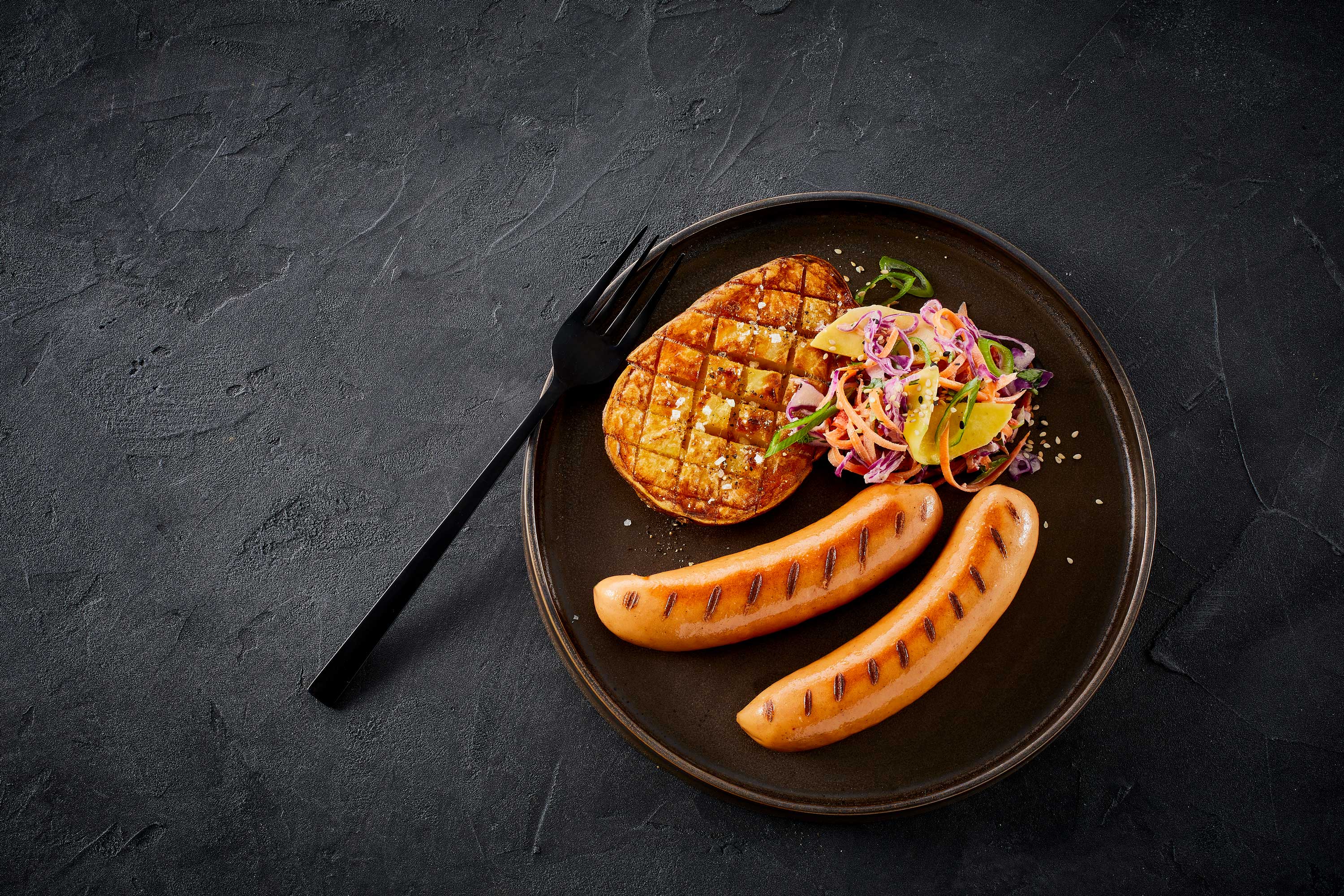 Krydret, cremet og frisk på samme tid. Frankfurtere får modspil af en spicy øl-slaw med mango, der tilfører både sødme og syre, og serveres med sprøde, gyldne halve bagte kartofler. Kombinationen af det varme, det friske og det sprøde giver en ret med masser af kontrast og smag i hver bid. Det er en uformel, men gennemført servering, der passer perfekt til både weekendhygge, grillstemning eller når der bare skal lidt ekstra på tallerkenen.