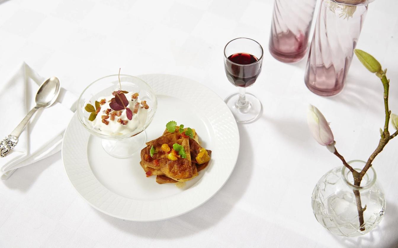 Sprøde vafler med hjemmelavet is, baconkrymmel og hybenkompot