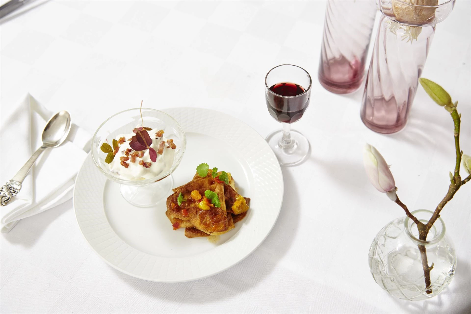 Sprøde vafler med hjemmelavet is, baconkrymmel og hybenkompot