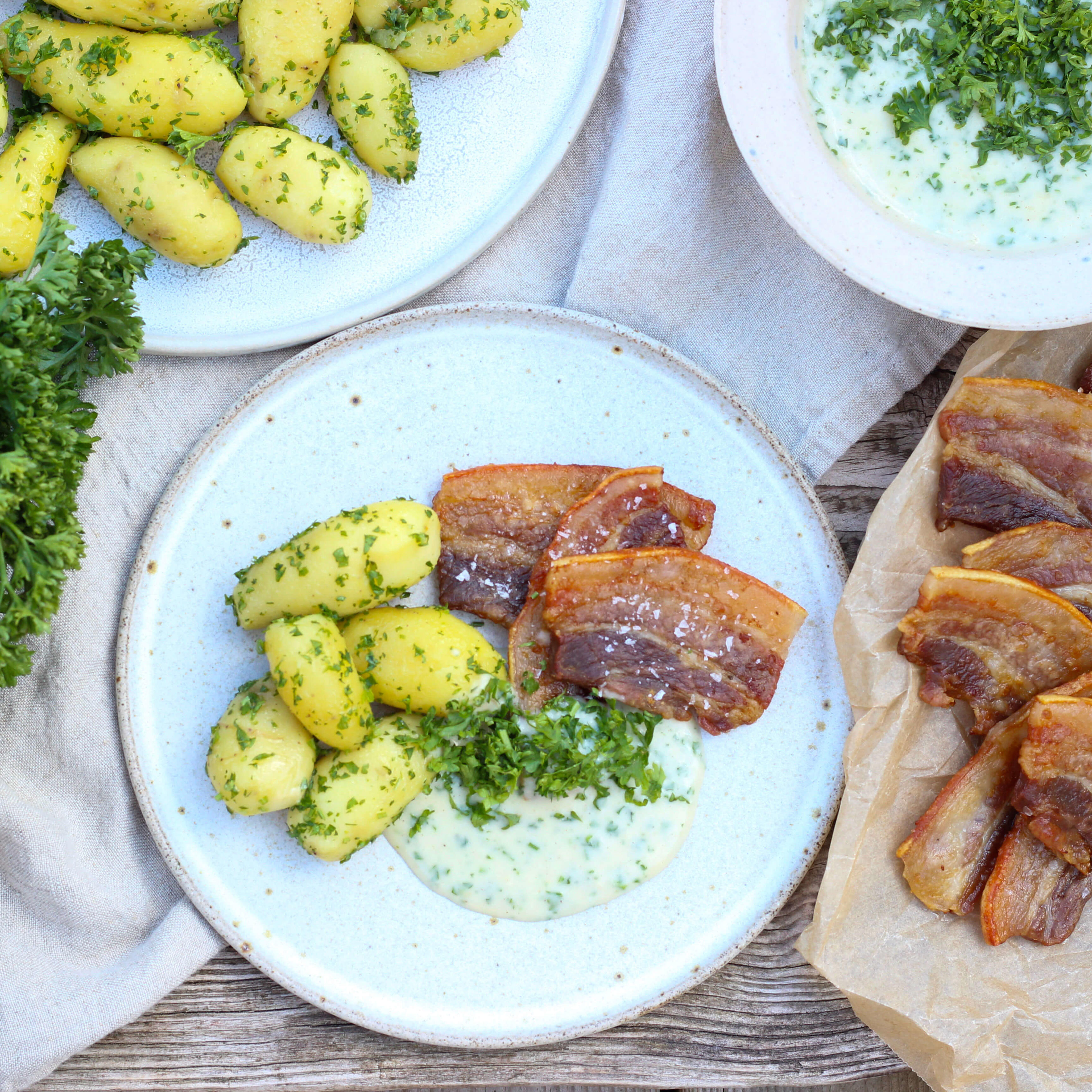 Få opskriften på stegt flæsk med persillesovs