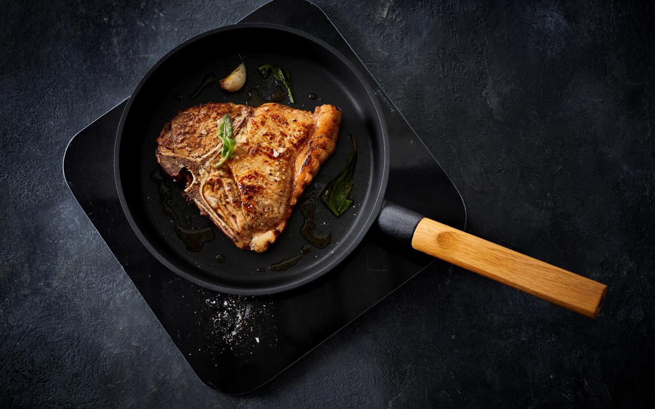 Denne metode giver en flot stegeskorpe og et saftigt resultat – perfekt, hvis du vil lave t-bone steak på pande.