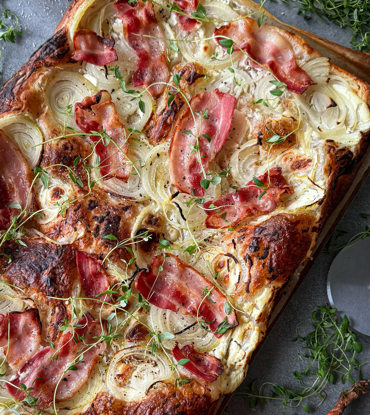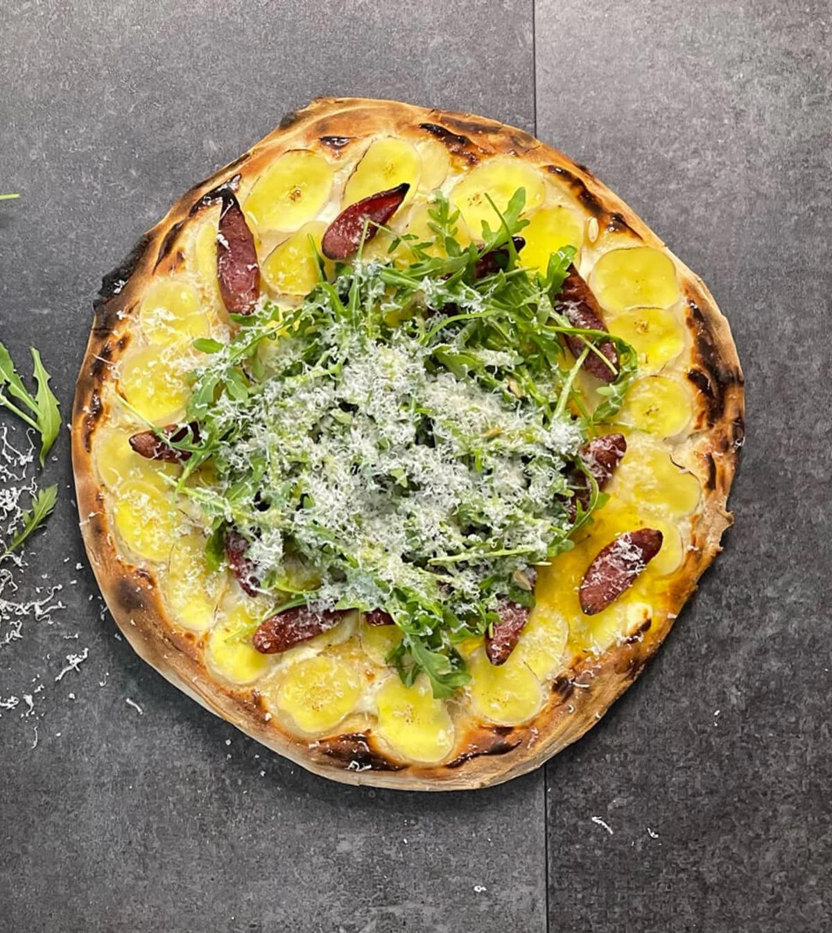 Tortilla‑kartoffelpizza med rødløg og oliven