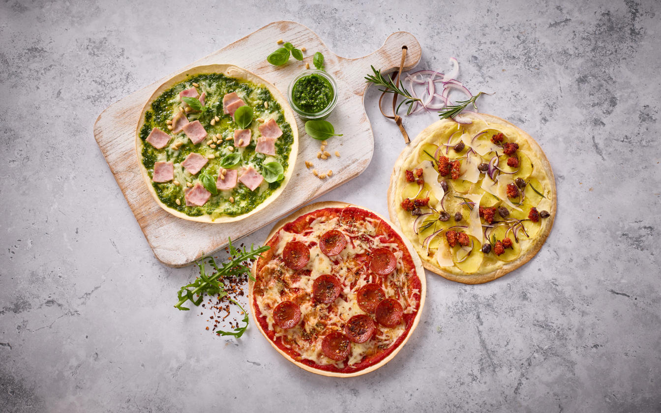 Prøv vores opskrift på tortilla pizza – en nem og hurtig måde at lave pizza på, hvor du får sprød bund og masser af smag på få minutter. Her får du tre varianter i én opskrift: en klassisk tortilla pizza med pepperoni, en hvid pizza med kartoffel, rødløg og oliven samt en version med pesto, skinke og parmesan.