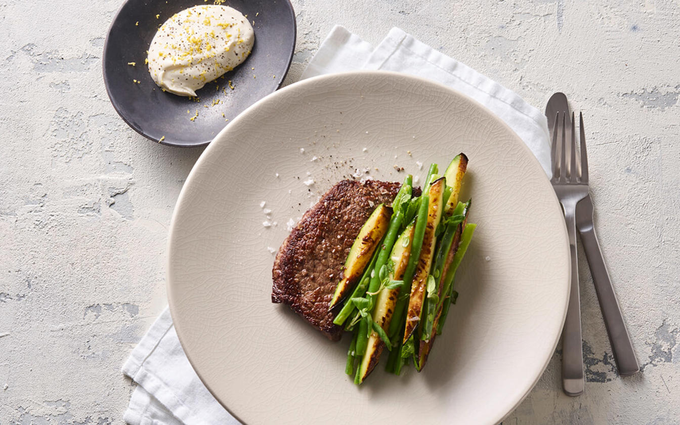Her serveres tykstegsmedaljonerne med stegte courgetter og bønner samt hjemmelavet vinaigrette og saltet creme fraiche med citron. Det er en enkel og smagfuld ret, der kombinerer saftigt oksekød med friske grøntsager. Perfekt til både hverdag og gæstemiddage, når du vil imponere med noget lækkert, der ikke kræver mange timer i køkkenet.