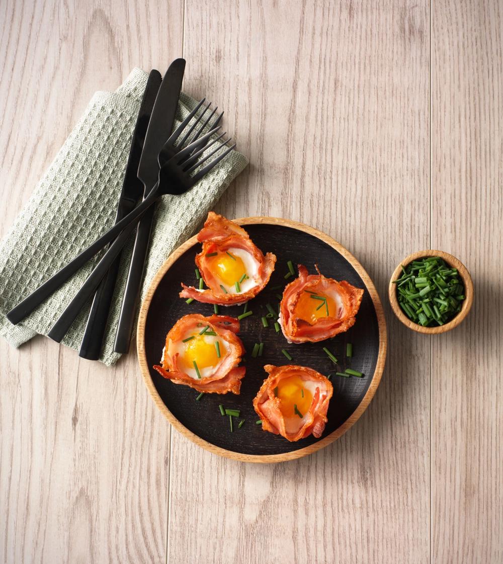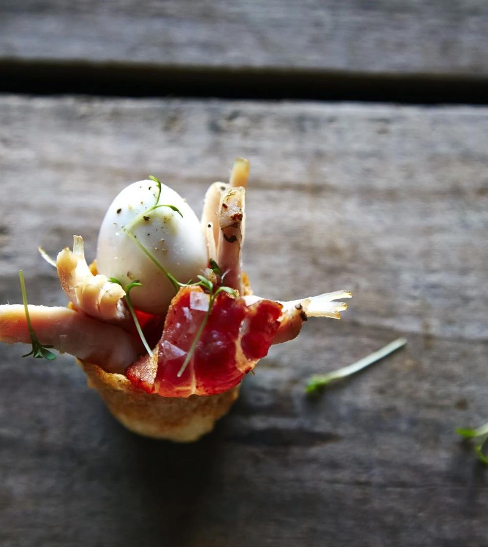 Denne snack er lækker velegnet til børn: vagtelæg med sprødstegt bacon, serveret med frisk salat. Denne lækre kombination af den delikate smag fra vagtelæg og den røgede bacon skaber en lækker forret eller snack, der vil vil glæde både børn og voksne.