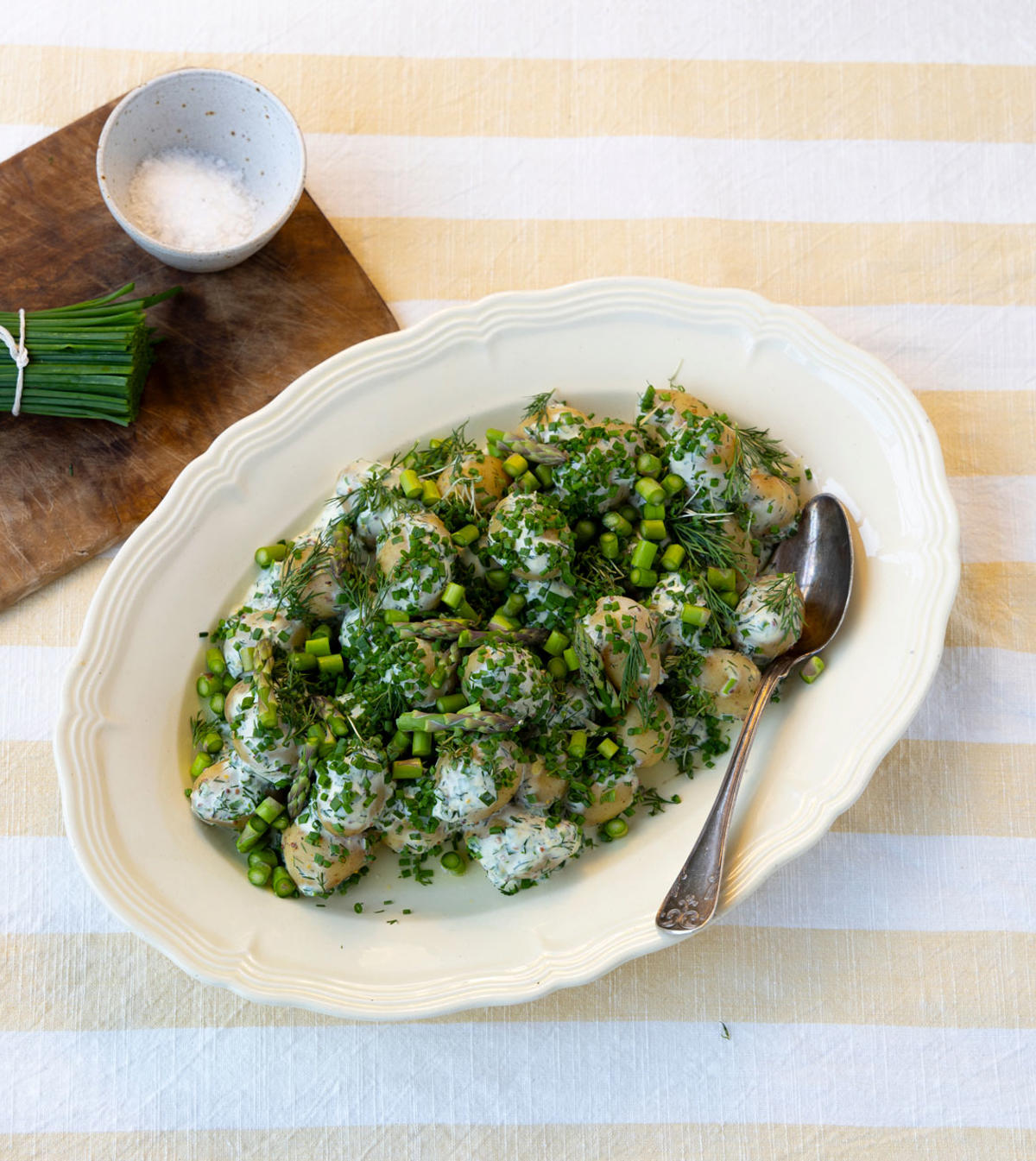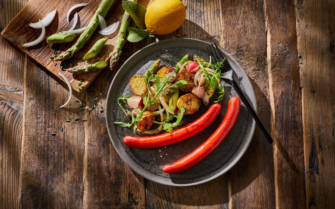 Forestil dig en lun sommeraften, hvor du samles med venner og familie for at nyde lækker mad og godt selskab. Lige dér kan du servere vores varme kartoffelsalat med asparges og radiser. Kartoflerne bliver bagt i ovnen med olivenolie og krydderier og blandes med friske asparges og farverige radiser i en lækker kombination af smage og teksturer.