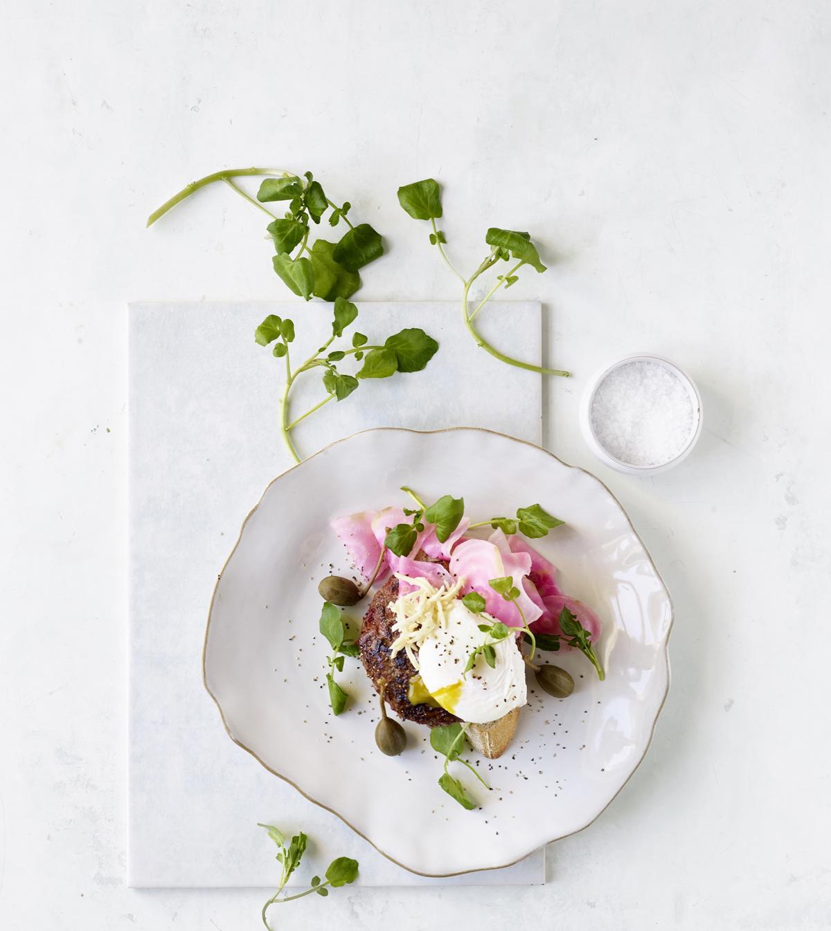 - I denne opskrift serverer vi pariserbøffen med en frisk udgave af den traditionelle syltede rødbede, nemlig en lækker portion rødbederåkost. Men det skal ikke holde dig tilbage fra at supplere op med lækre ting fra skabet med syltede ting! Vi synes nemlig også at både kapers og de små, franske syltede agurker, kaldet cornichoner, passer rigtig godt til bøffen.