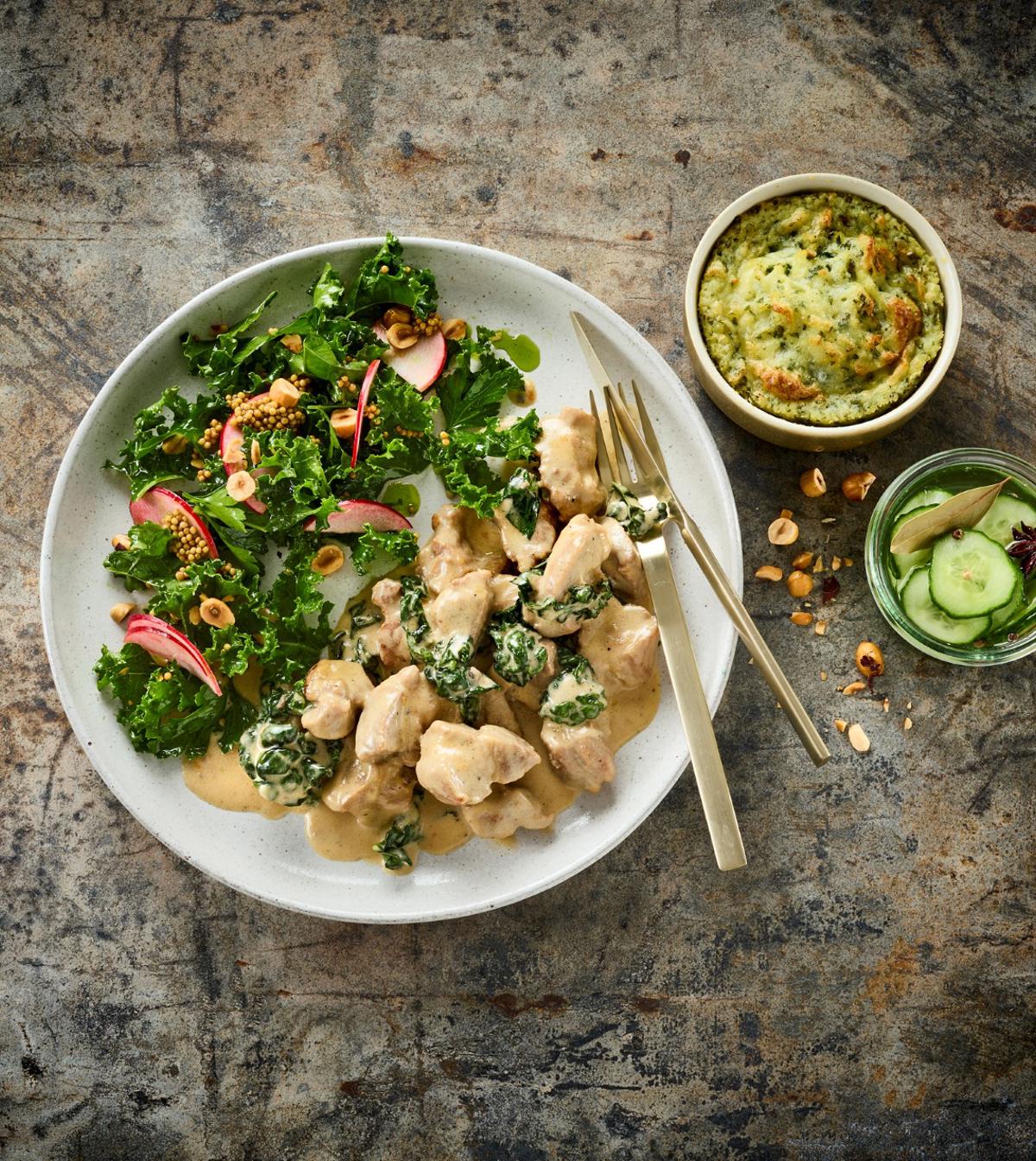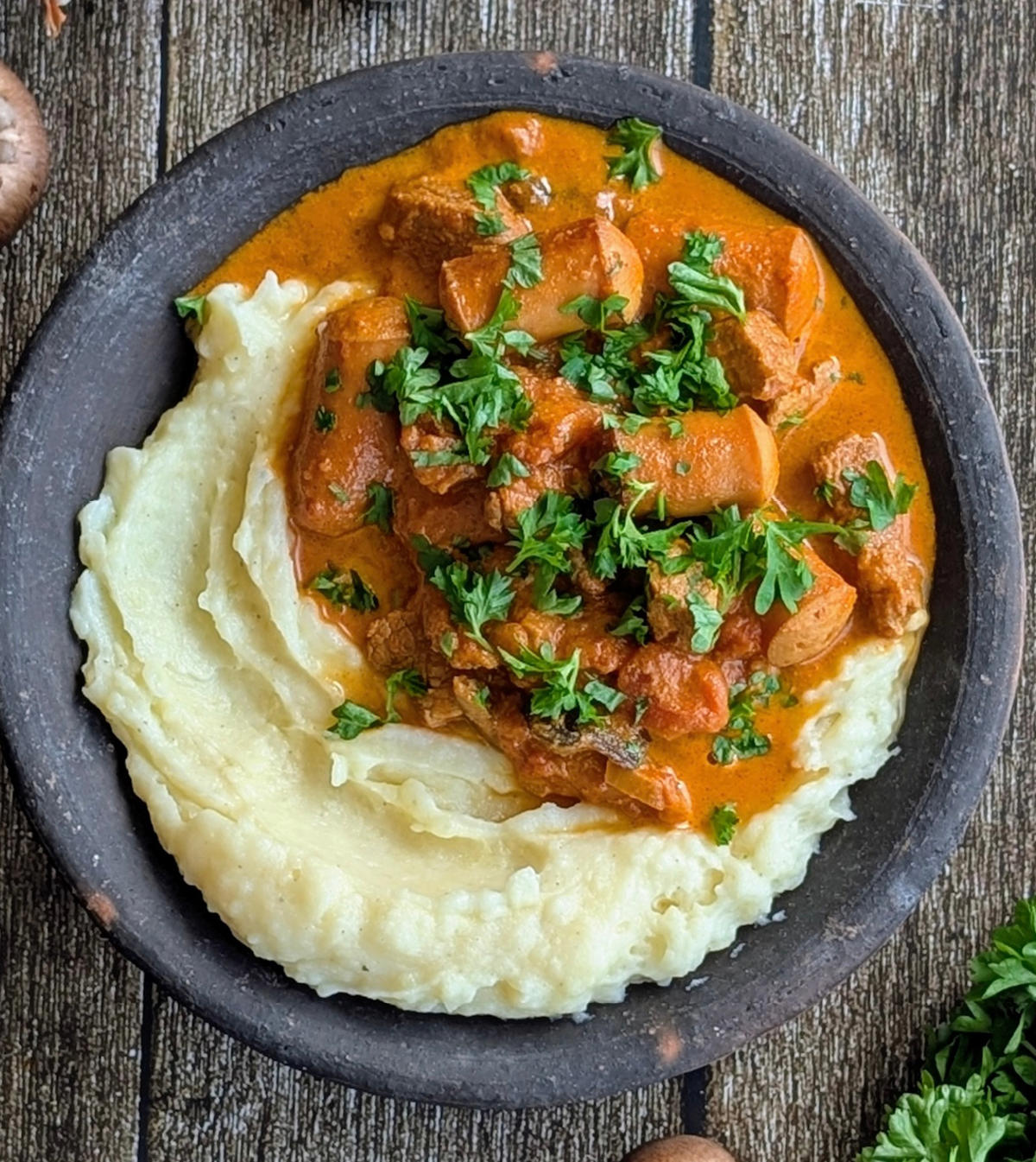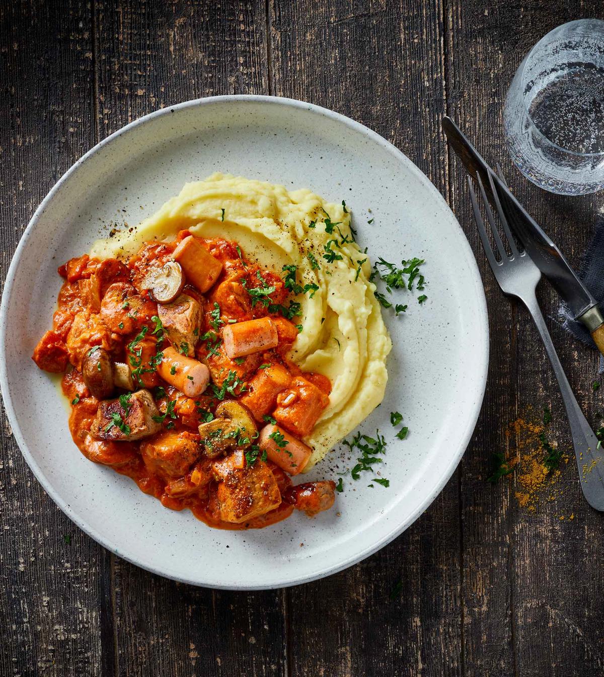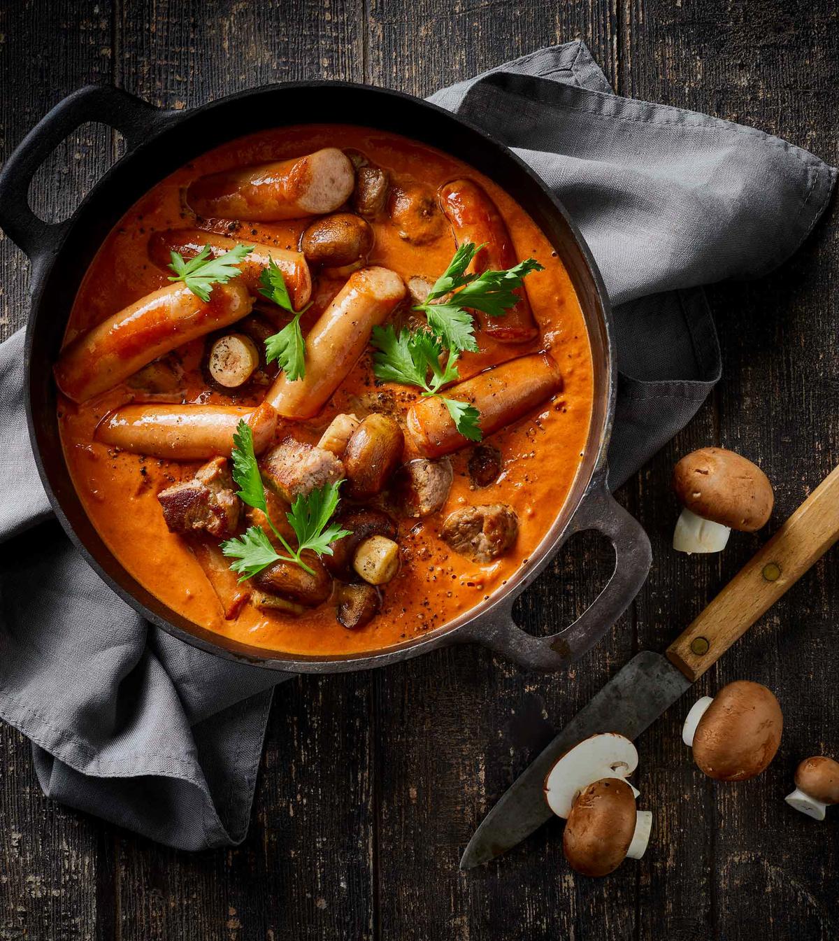 Udover pølser og bacon fyldes gryden med champignoner og ærter, som bliver smagt til med paprika og frisk persille. Resultatet er en krydret vintergryde, som du kan varme dig ved på en kold vinterdag.