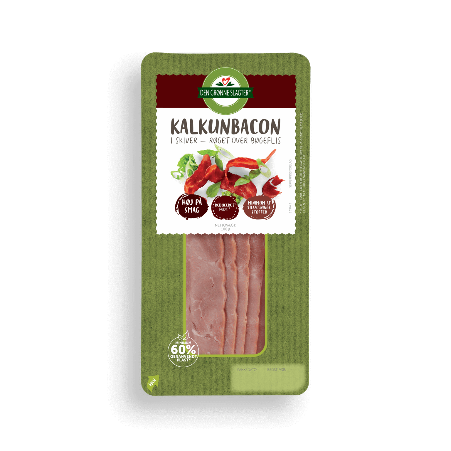 100 gDen lækre smag af bacon er noget, de fleste holder af. Og med kalkunbacon fra Den Grønne Slagter som indeholder 4,5 procent fedt, kan du få den gode men lette baconsmag, uanset om der skal steges bacon på panden eller bruges til eksempelvis pizza, gryderetter, pastaretter eller salater. Den Grønne Slagter kalkunbacon er lavet af saftigt kalkunlårkød, der er saltet og røget over bøgeflis for at give den fine baconsmag. Vores kalkunbacon er med 18% protein naturlig rig på protein.
