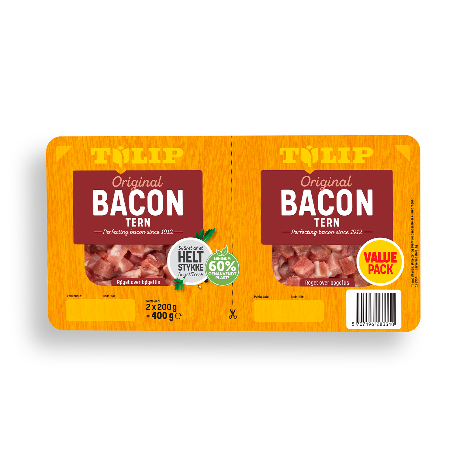 400 gTulip Bacon i tern er lavet af bryst af gris. Først salter vi kødet, hvorefter vi røger det over bøgeflis, så du får en intens smagsoplevelse. Den røgede bacon skærer vi i tern, så de er lette for dig at bruge i sammenkogte retter, i salater eller som topping på dine favoritretter.