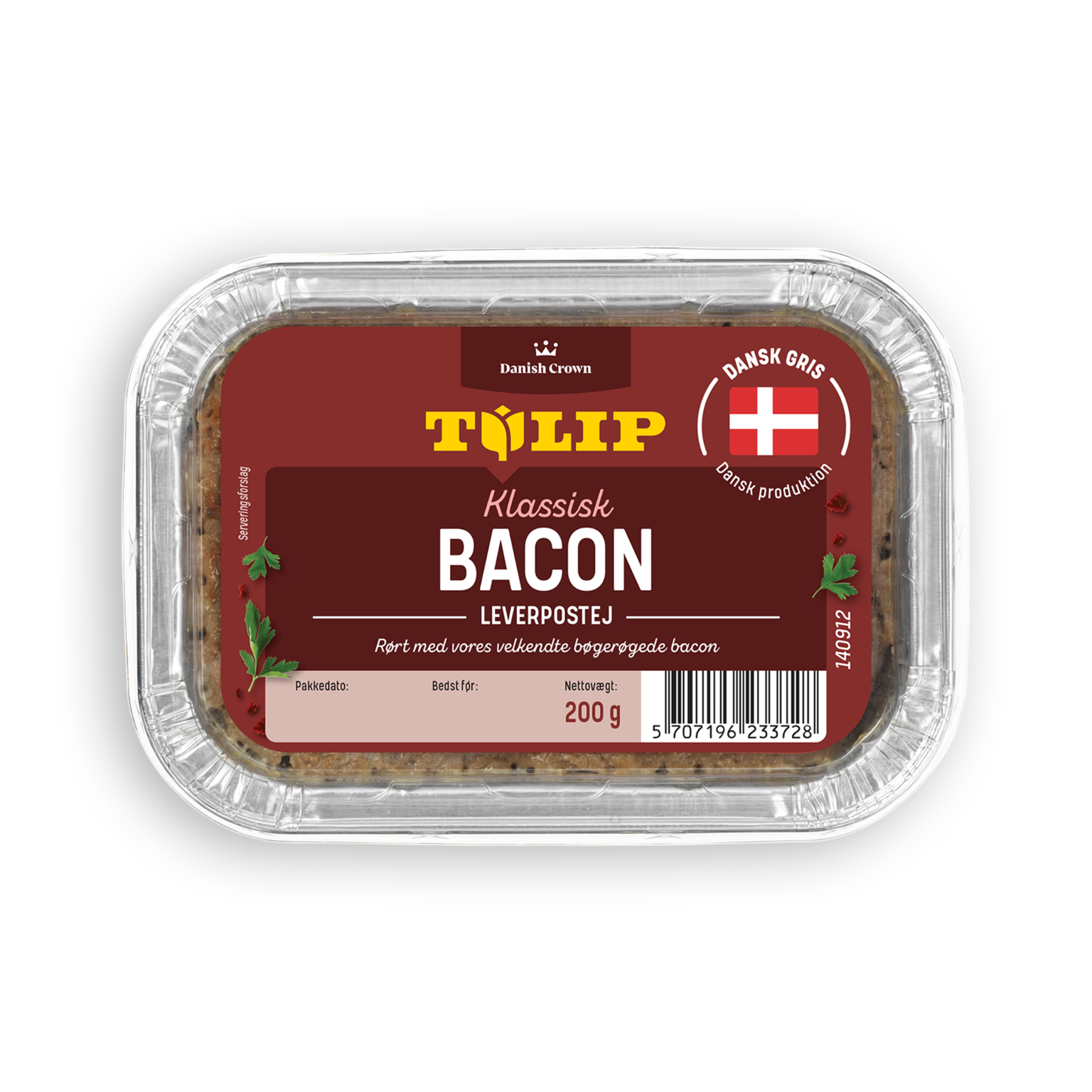 200 gTulip Bacon Leverpostej er fremstillet i Danmark af dansk gris. Den er bagt med vores velkendt bøgerøgede Tulip Bacon, som giver en forrygende smag. Ikke tilsat mælk og gluten.