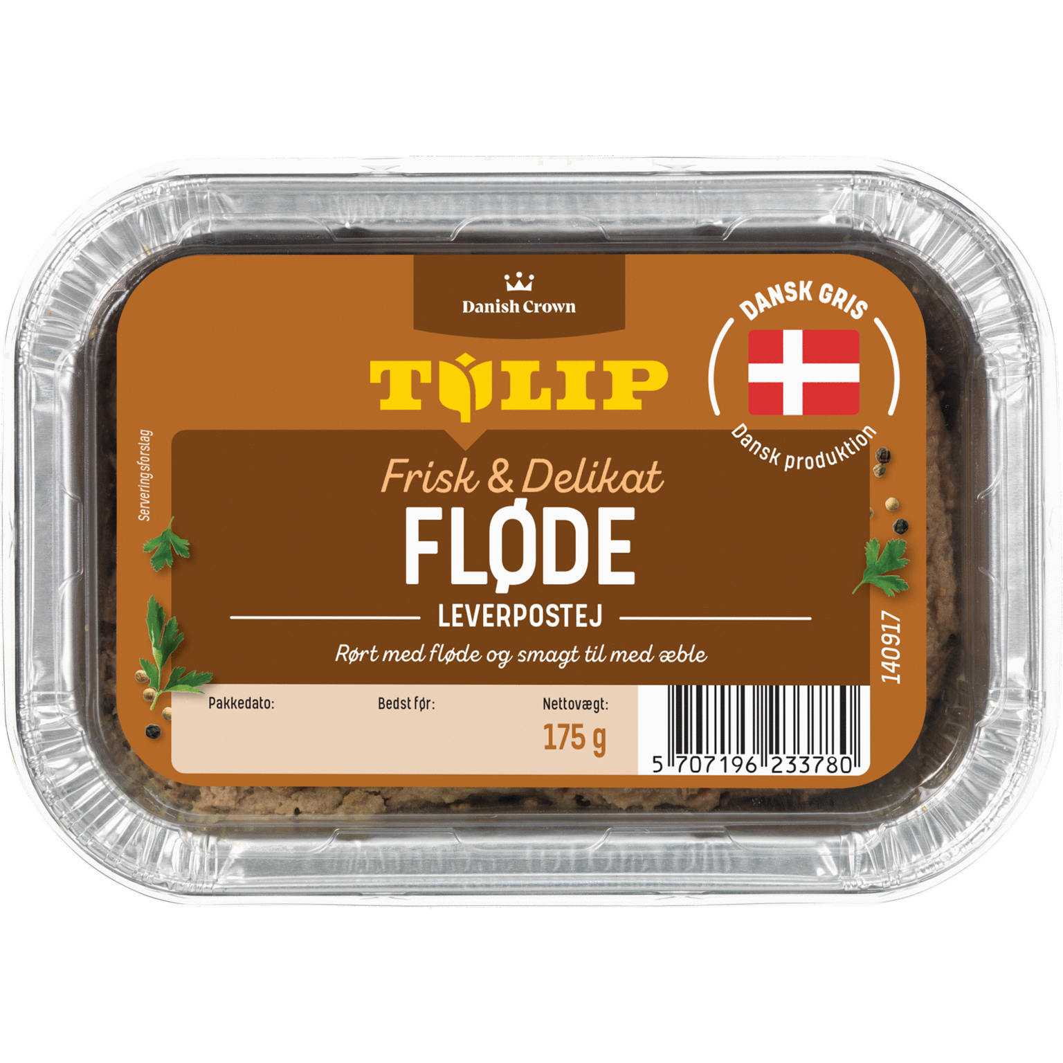 175 gTulip Fløde Leverpostej er en delikat smagsoplevelse. Den er rørt med æble og fløde , som giver en skøn cremet konsistens og en frisk, sød smag af æble - oplagt til madpakken, frokostbordet eller aftenmåltidet. Tulip Fløde Leverpostej er fremstillet i Danmark af dansk gris.