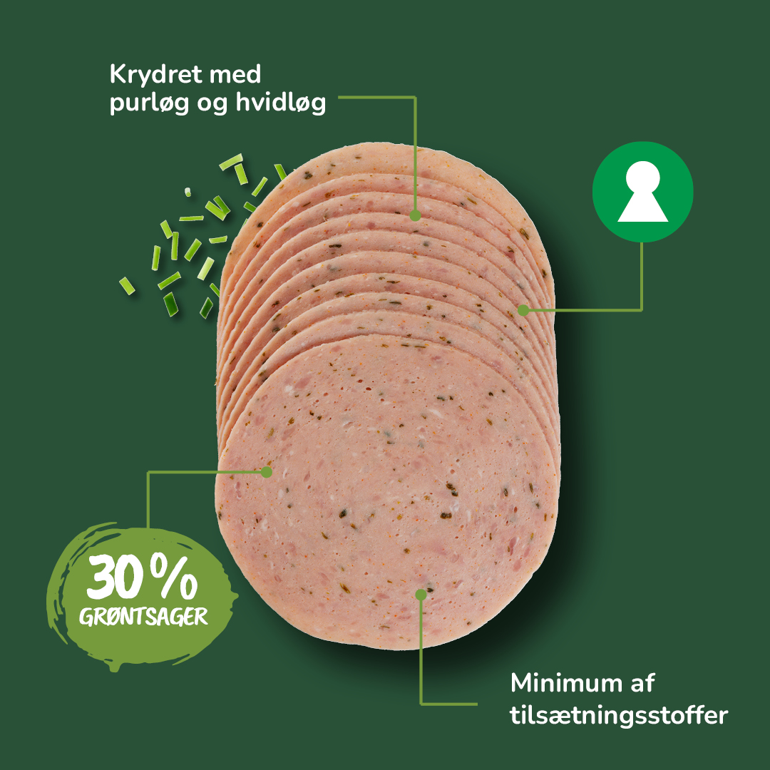 100 gVores nye Jægerpølse er magert grisekød tilsat 30% persillerod, pastinak, fennikel og sød kartoffel. For at give et ekstra pift har vi smagt til med hvidløg og purløg. Vi håber det giver dig lyst til at spise sundt - velbekomme!