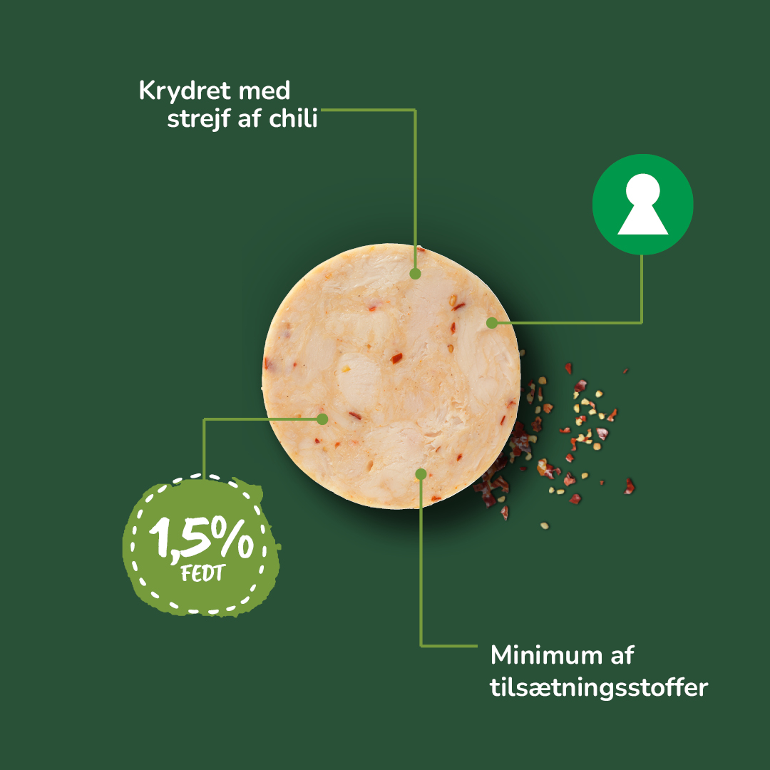 INGREDIENSER: Kyllingebryst (87%), vand, modificeret majsstivelse, salt, chili, peber, hvidløg, konserveringsmiddel (natriumnitrit).