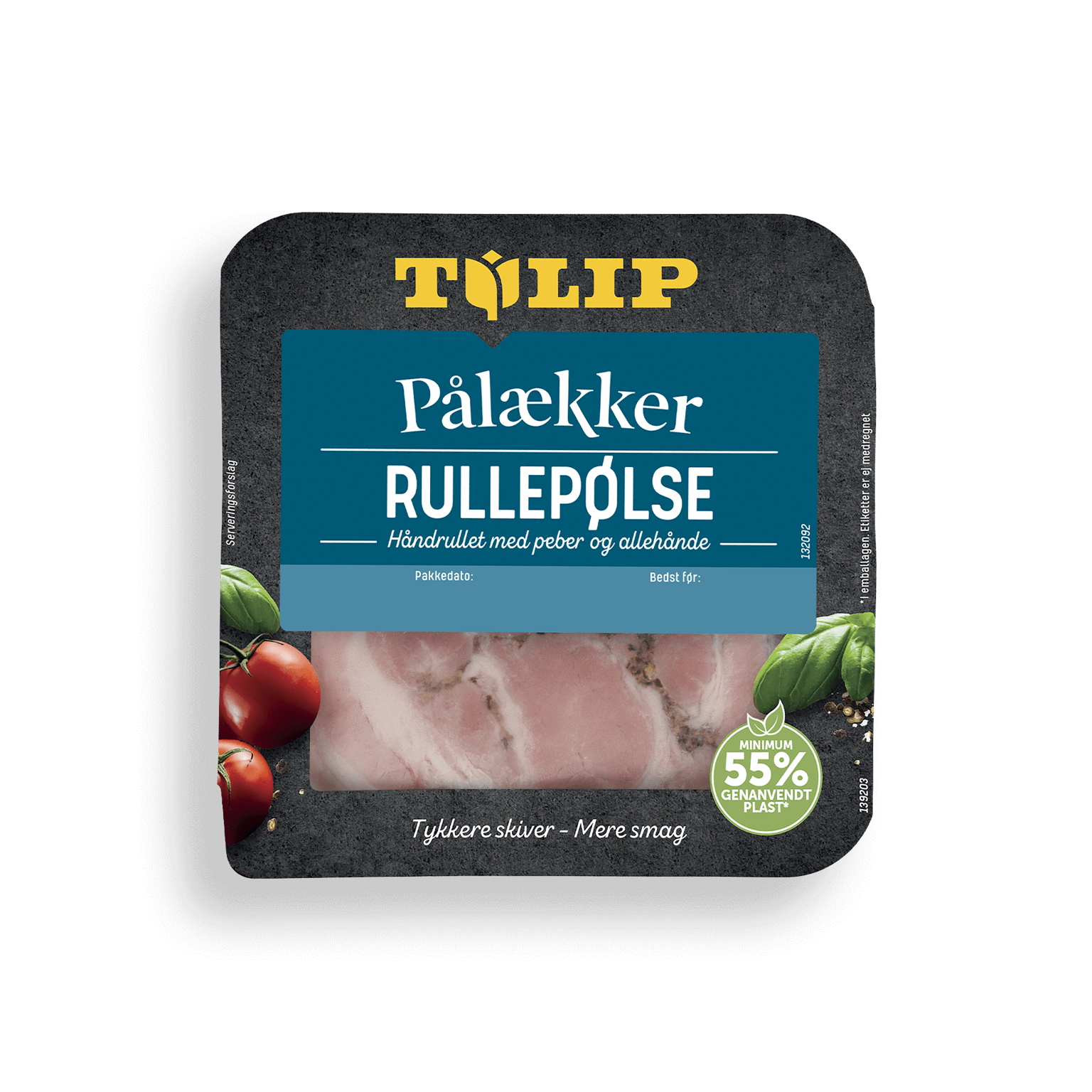 90 gTil Tulip Pålækker Rullepølse bruger vi trimmet og tilskåret brystflæsk. Vi ruller kødet i hånden og krydrer med peber, allehånde og løg. Derpå koger vi rullepølsen, til den er perfekt mør. For at give den bedste smagsoplevelse skærer vi Tulip Pålækker Rullepølse