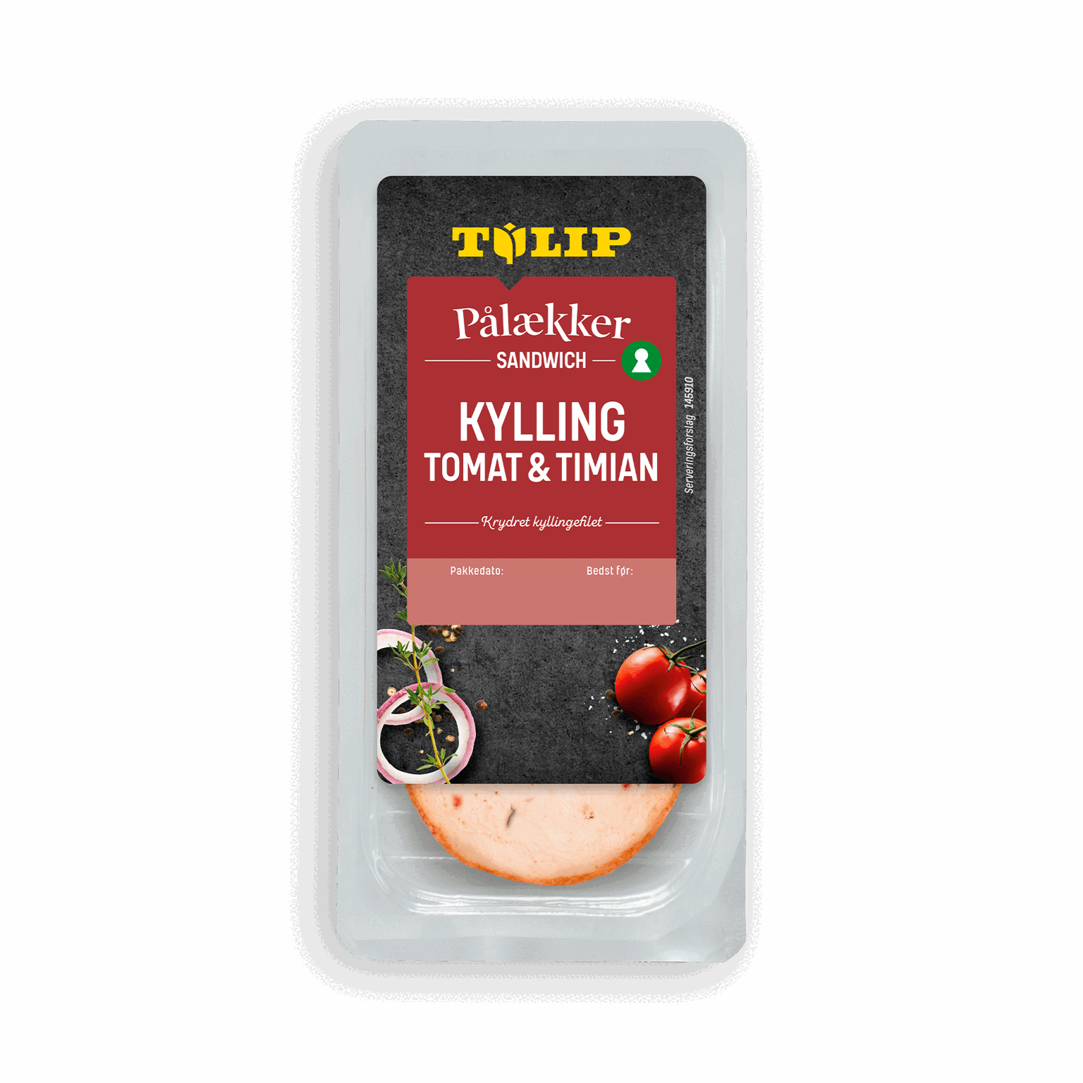 90 gTil Tulip Pålækker Sandwich Kylling Tomat & Timian bruger vi hele kyllingebryster, som skæres i mindre stykker og tilsættes tørrede tomater. Kødet marineres i saltlage før nænsom kogning.