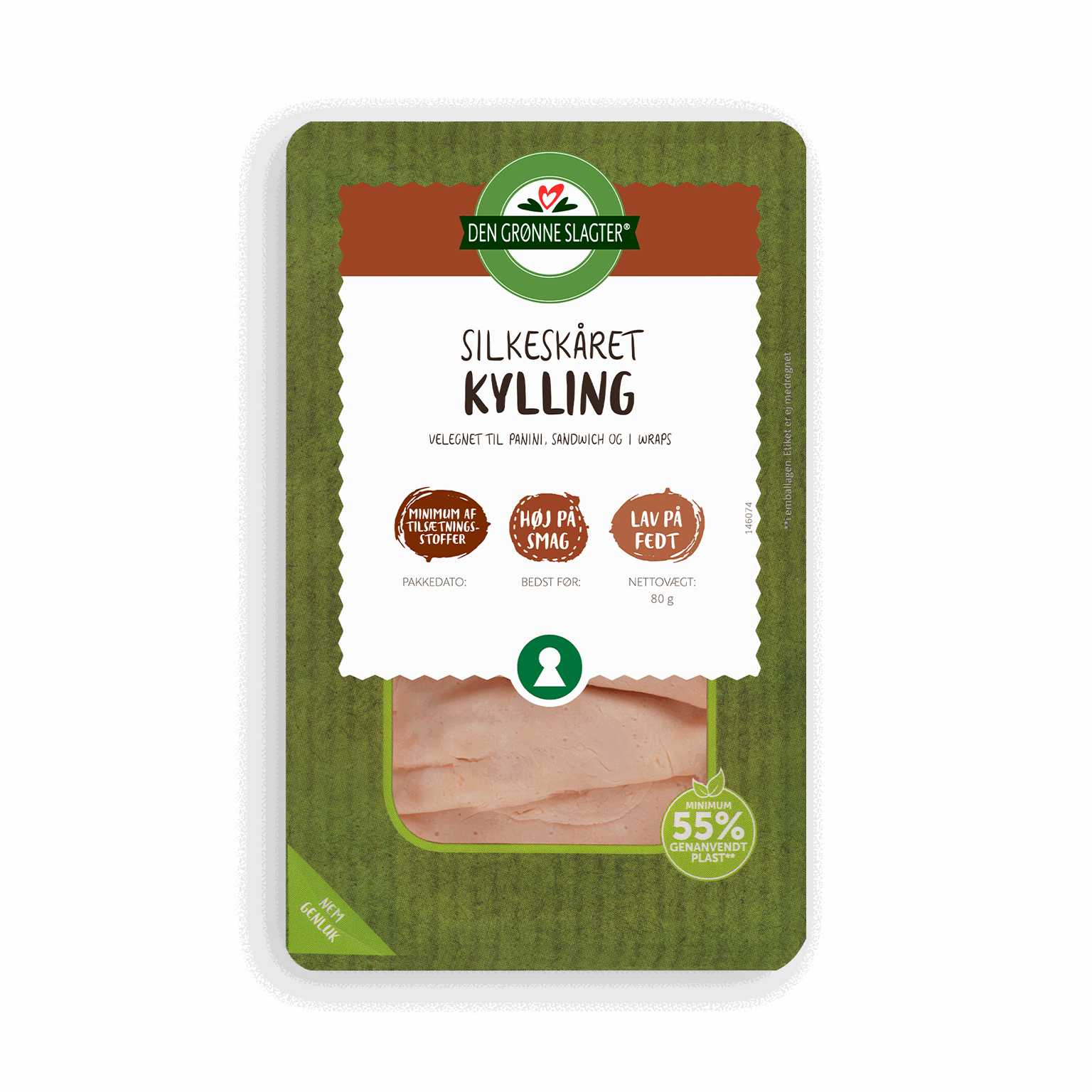 80 gDen Grønne Slagter Silkeskåret Kylling er lavet af kyllingebryst, der er kogt for den helt rigtige mørhed. Vores Silkeskårede Kylling overholder samtidig kravene til Nøglehulsmærket. Pålægget er velegnet til både børn og voksne, og er med sine silkeskårede skiver ideel at bruge i panini, sandwiches og wraps. Vi håber, det giver dig lyst til at spise sundt - Velbekomme!