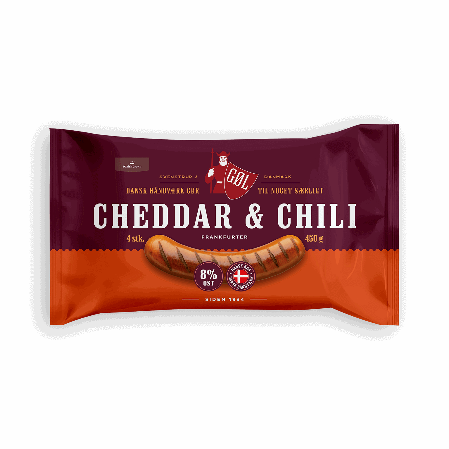 450 gGØL Frankfurter med cheddar & chili er en lidt mere temperamentsfuld pølse. Den forener det lækre og cremede fra cheddarosten med styrken og det krydrede element fra chilien i en skøn smagskombination og oplevelse. Frankfurteren kan både serveres på solrige sommeraftener og hyggelige vinterdage, hvilket gør den til en alsidig favorit året rundt.