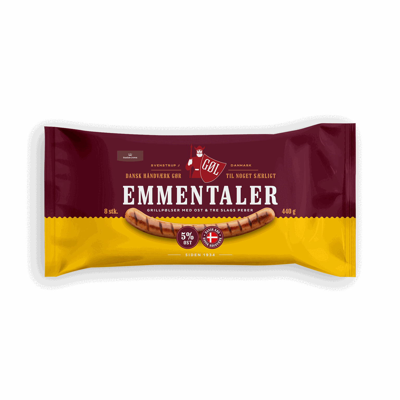 440 gGØL Grillpølser med emmentaler og peber er en lækker pølse, som vi er stolte af at kunne præsentere til sommerens mange hyggestunder. Ostepølsen er en ægte kvalitetspølse fremstillet efter stolte håndværksmæssige traditioner på vores nordjyske pølsemageri – og selvfølgelig med kød fra danske grise. Læs mere om pølsen her.