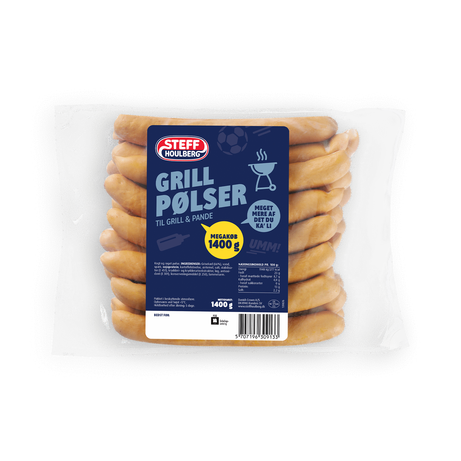 Ingredienser: Grisekød (66%), vand, spæk, SOJAPROTEIN, kartoffelstivelse, ærtemel, salt, stabilisator (E 451), krydderi- og krydderurteekstrakter, løg, antioxidant (E 301), konserveringsmiddel (E 250), lammetarm.