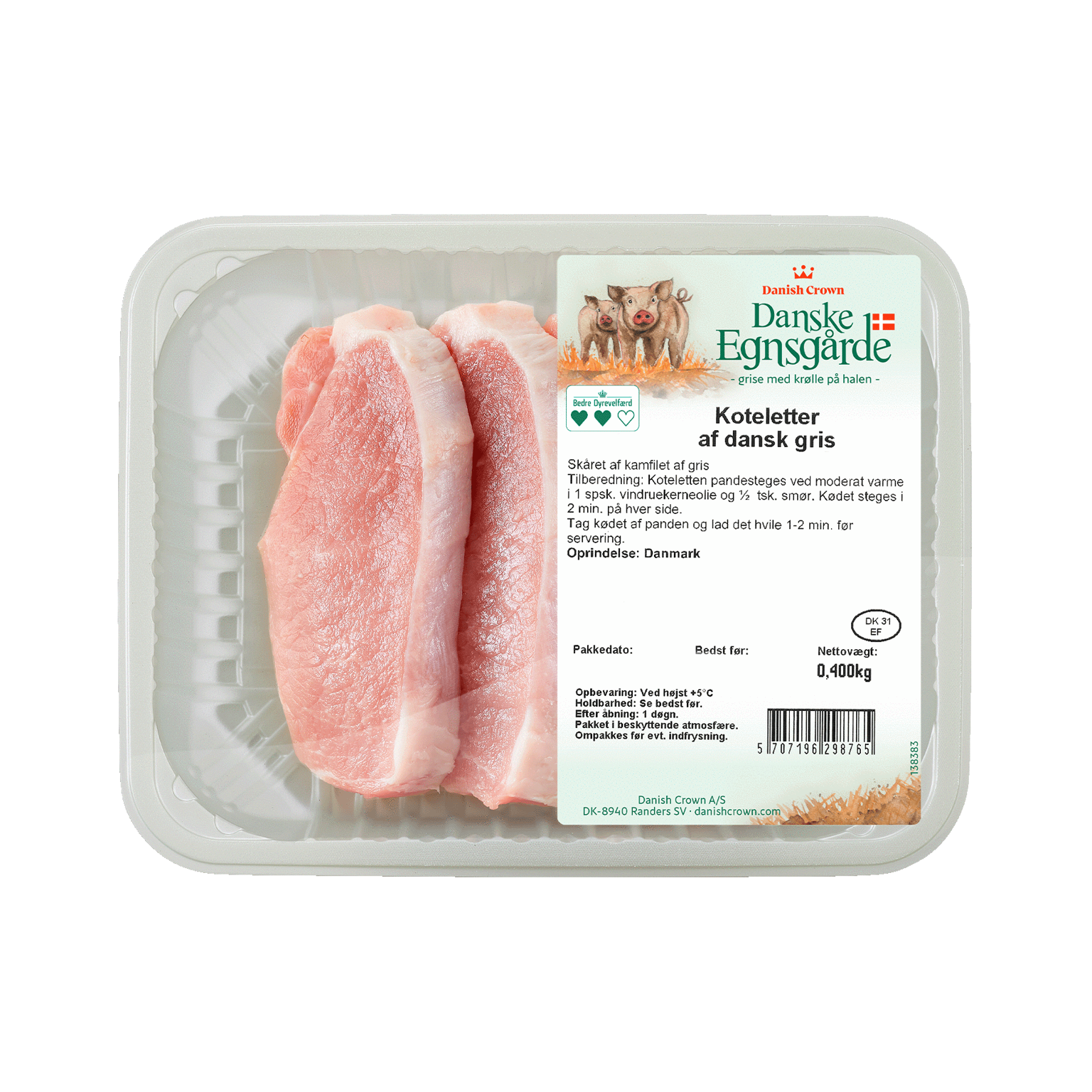 Danske Egnsgårde koteletter er skåret af 100% dansk filet fra en særlig udvalgt og afpudset kam. For at bibeholde saften i koteletterne kan det anbefales at salte dem og derefter stege dem på panden ved høj varme. Koteletterne er også særdeles velegnede til en traditionel dansk ret såsom koteletter i fad eller som et magert alternativ til at komme i pastaretter og wok.